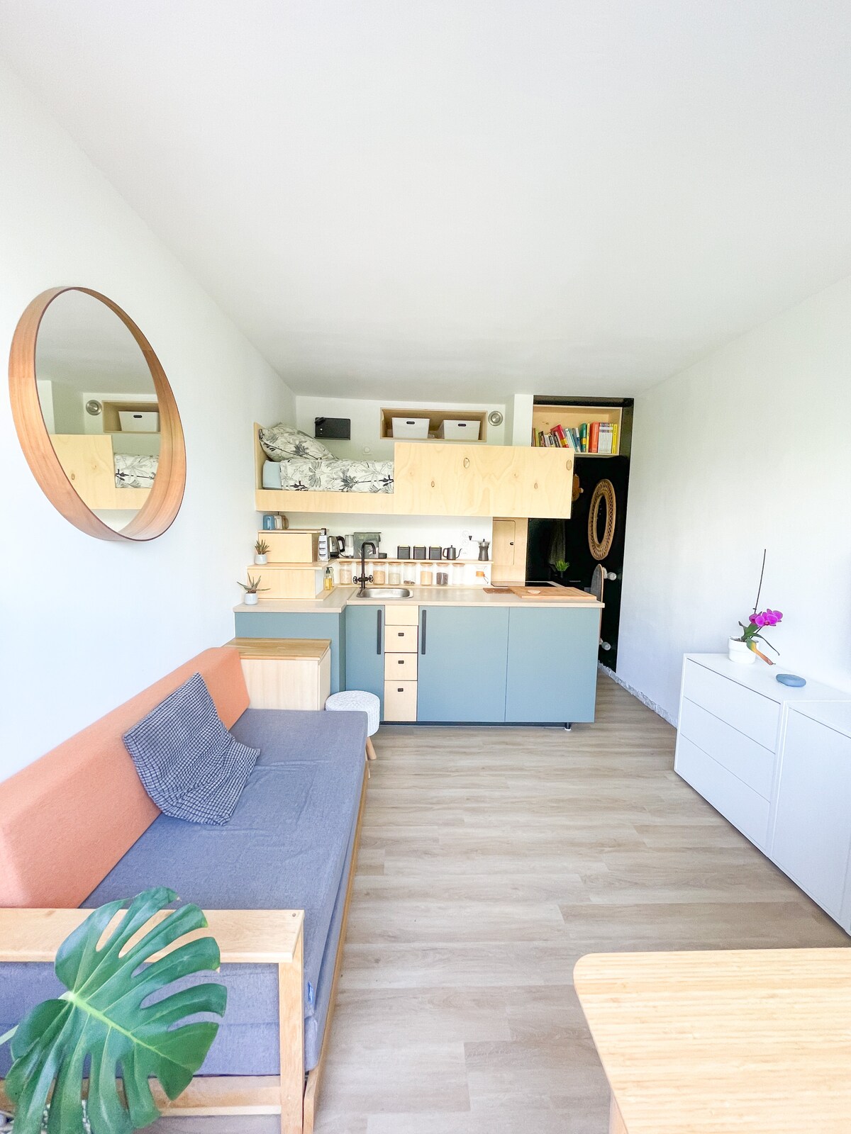 Between port and beach, fully renovated furnished studio for 2 people, on the 7th and top floor of a residence with 2 elevators Living room with sofa bed, blackout curtains have been installed for the night (no shutters) Fitted and equipped kitchen: 2-burner induction stove, fridge, Senseo coffee maker, microwave. Bathroom with toilet, shower, washing machine Private parking🅿 space included, which is essential for your peace of mind in the summer season Shared bike storage available