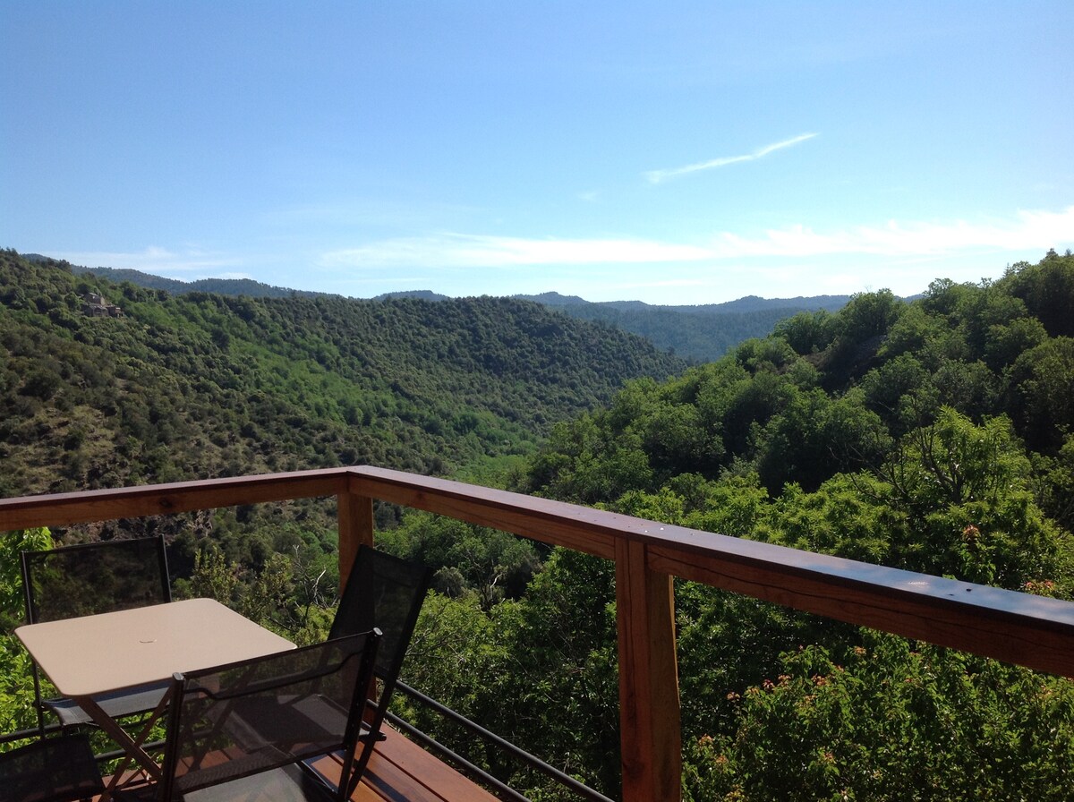 A blissfully peaceful and beautiful retreat. The renovated cottage is a small 2 storey house perfect for 2 people, in a magnificent estate of 94 acres of chestnut forest, sublime experience for nature lovers, who want to get away from the hustle and bustle, wonderful walking trails, magnificent views. Natural small pool on the property but there is a sublime swimming spot at 9km. Bedroom and wood heater upstairs, bathroom, separate toilet and open kitchen downstairs. Private terrace.