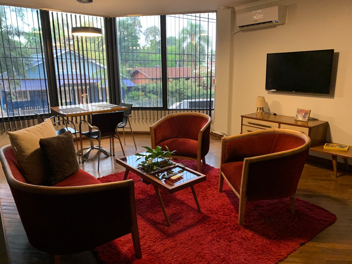 Enjoy this spacious and bright apartment in downtown Iguazú. It has 2 bedrooms, 2 full bathrooms, balconies and a grill, ideal for relaxing after a day of walking. The kitchen is fully stocked so you can cook comfortably, and from the balconies you can see green views that invite you to rest. Its location is unbeatable: you are close to everything, with the tranquility to enjoy as if you were at home. Plus a jacuzzi, fast wifi, and workspace.