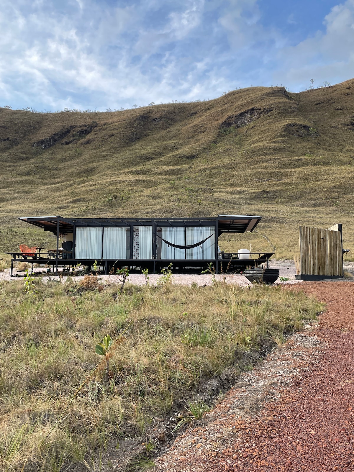 The house is located within a gated community in the middle of the cerrado overlooking Serra de Santana, located in Chapada dos Veadeiros National Park. Just 3.5 km from the center of Cavalcante and close to several waterfalls. Newly built, the house's design is based on wood, glass and steel and was conceived to favor the view of the landscape, the sunrise and sunset. By the way, the spectacular view of the Serra throughout the house makes the stay a unique experience.