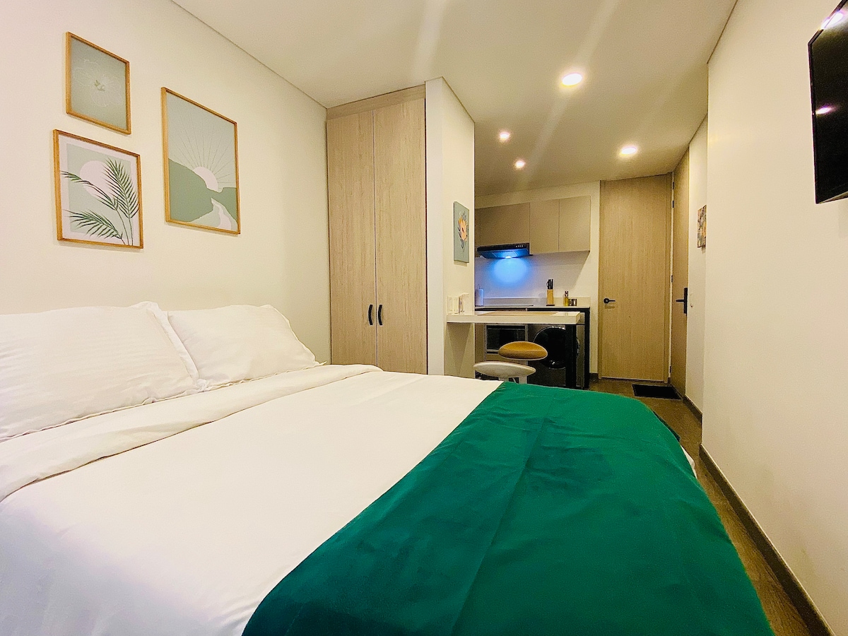 Cozy Loft with natural lighting, 5th floor, single room with full open kitchen, bathroom, double bed, closet, desk, Smart TV and high speed fiber optic internet, close to restaurants, banks, main roads, public transport, Transmilenio station, in a wonderful park, ideal for walking and relaxing outdoors. The Building has 24-hour surveillance, has an elevator, terrace and communal laundry.