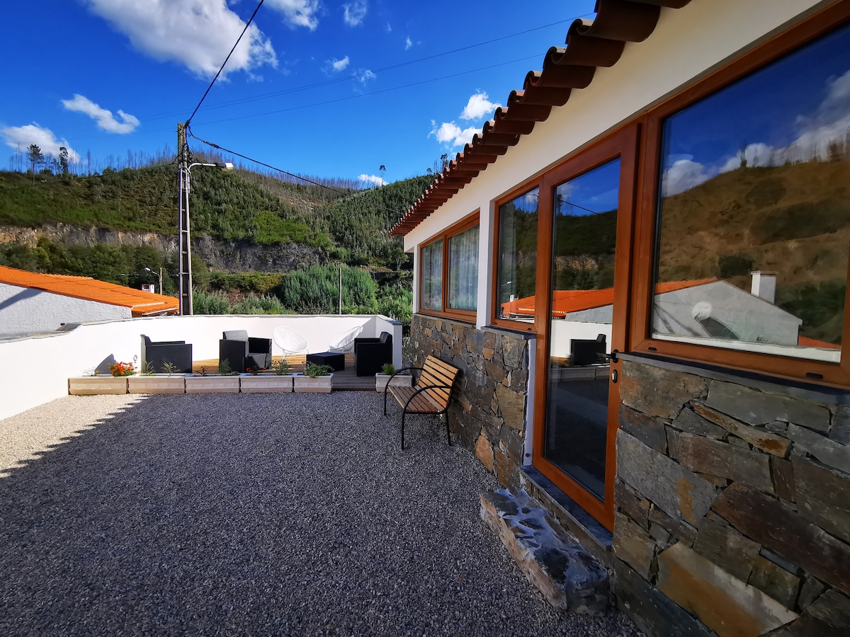 House located in Lousã, with a view over the beautiful village. You can enjoy the sun on the shale terrace, which allows you to dine outdoors, in perfect harmony with the surrounding nature. It is located just 800m from the new wooden walkways, which will take you to the castle and the natural pools. It is located a few kilometers from the schist villages of Serra da Lousã and the iconic Trevim swing. Ideal for those who enjoy mountain activities or simply to relax.