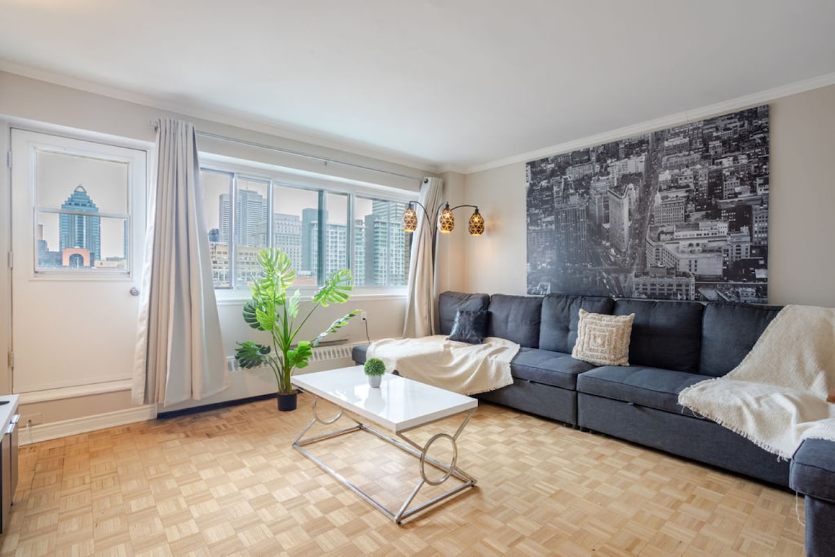 Welcome to a bright, cozy 1-bedroom apartment in the heart of Downtown Montreal. Perfect for up to 4 guests, it features a queen bed, sofa bed, and 1 bathroom. Enjoy a fully equipped kitchen, comfy living space, and fast Wi-Fi. Steps from top restaurants, shops, and city attractions, it’s the ideal base for exploring Montreal in comfort and style.