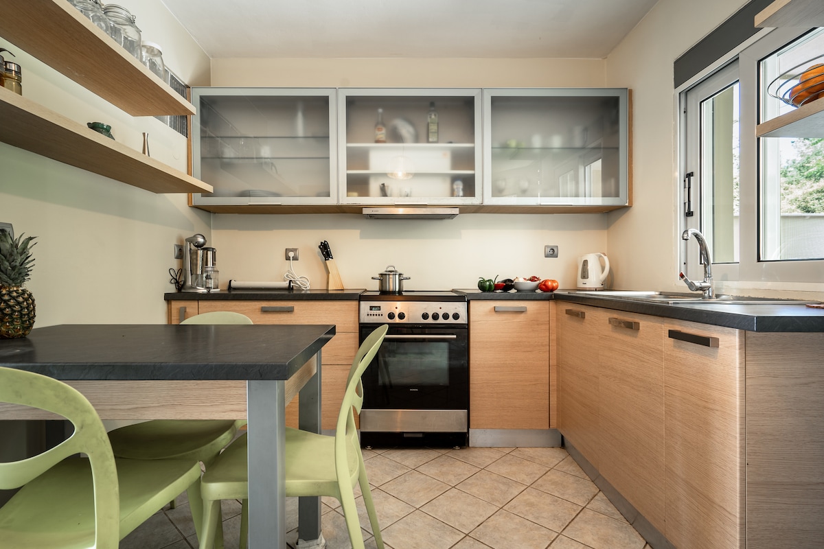 Katerina Mare at Lourdas Beach offers a unique rental experience, 5 steps away from the shore. Enjoy stunning views, soothing sounds of the waves, and unforgettable sunsets. Restaurants and a mini-market are just a minute away. Relax in the garden surrounded by lush greenery. Beach access is convenient via nearby stairs. No car is needed as the local bus connects to popular areas within walking distance.