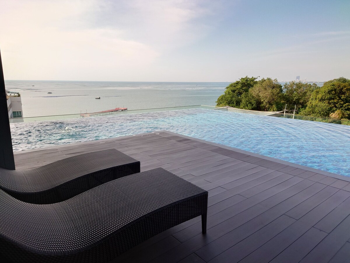 The apartment's Japanese style bedroom features a comfortable king-size bed and large windows that offer a picturesque view of the ocean. It also offers Onsen, Infinity pool with ocean view, clean, bridge access to sea, great spot for sunset, a hidden gem in the Sriracha-Pattaya region.
