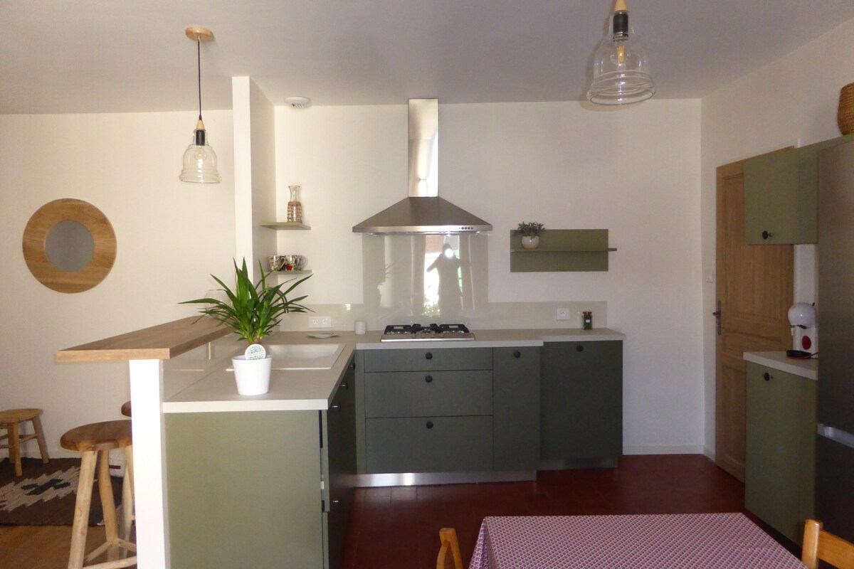 This is our newest 3 bedroom gite on the property. The kitchen is fully functional and spacious. Two cooking induction rings are in function. You will also find a dishwasher and a coffee machine + a water boiler. The living room has basic yet comfortable furniture. The gite includes a private entrance and a garden. The swimming pool and terrain are shared with other guests. The property is not baby/child proof.