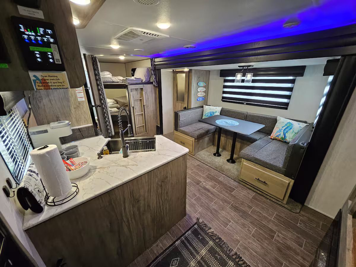 Be the first to book this sweet new camper at Hailey's Beach-n-Bay RV Resort! Super clean, with special touches like the electric fireplace and food pantry. Comfortable queen-size bed in front and big bunkbeds in the rear. Great family dining area and super clean kitchen, fully stocked with everything you need. Enjoy a meal outside with firepit and a new picnic table. Take the kids kayaking or watch them enjoy our pirate ship playground. Book your unforgettable vacation now!. The space: Sleeping up to 4 guests, this retreat features a private king master suite with a Smart TV and a cozy queen pull-out bed in the open living area. The living space also includes a second Smart TV, two recliners, and plenty of comfortable seating, ideal for movie nights, mid day naps, or unwinding after a day of adventure. The fully stocked kitchen features a residential size fridge, large pantry, and all the essentials for easy home cooked meals. The bar style dining seating offers a casual, relaxed place to eat, chat, and enjoy your favorite meals or morning coffee. Outside, make the most of your stay with access to top notch amenities: fish or crab off the private dock, explore the calm canal by kayak, take a ride on one of the bikes, or let the kids burn energy on the oversized pirate ship playground. The palapa area, complete with a grill, picnic tables, and cornhole, offers the perfect place to gather and enjoy the coastal breeze. From sunrises over the water to peaceful evenings under the stars, this bayside escape is your invitation to slow down and savor every moment.