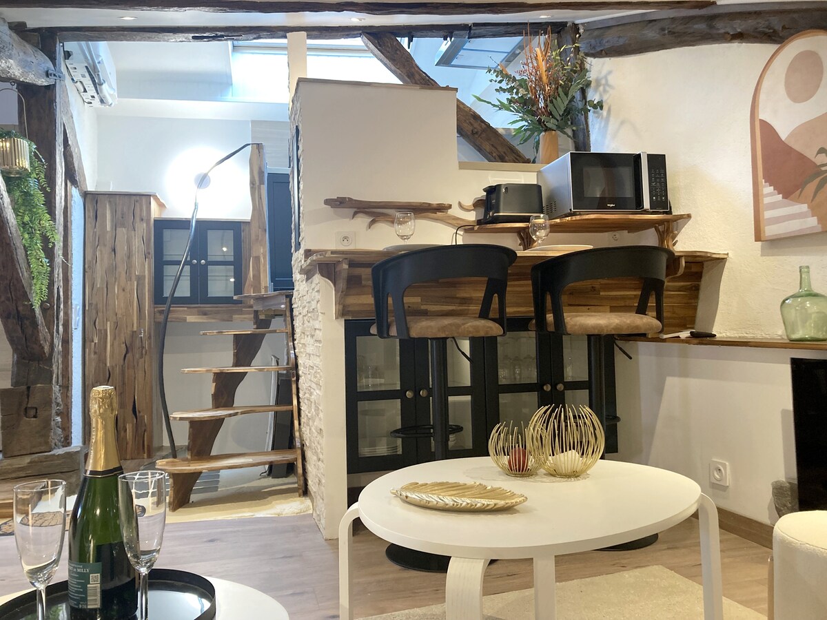 Petit appartement situé au rez de chaussée de notre maison, totalement indépendant, composé d'une grande pièce lumineuse avec un canapé convertible 2 places , un coin cuisine, une chambre de 14 m2 avec 1 lit double et 1 lit simple dans laquelle je peux rajouter un lit bébé, une salle de bain et un wc indépendant. Il est possible de profiter des extérieurs :terrasse de jardin avec table et 6 chaises, cour pour la voiture.