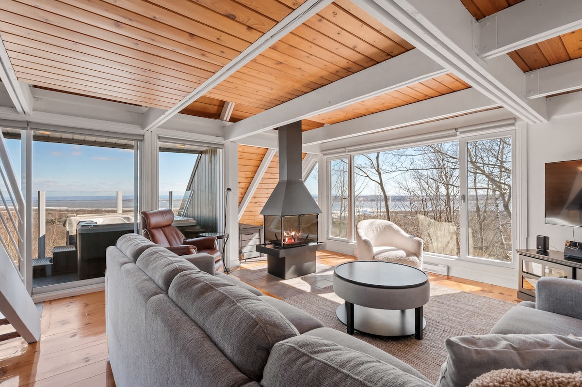 No parties allowed. 6 people maximum. Beautiful apartment located on the 2nd floor. Unique view and direct access to the St. Lawrence River. Open-concept space with cathedral ceiling including kitchen, dining room, and living room. 2 bedrooms with queen beds and 2 sofas that convert into single beds. Shared access to a lookout, heated pool, fire pits, BBQ, Etc. CITQ #310546 Another unit available on the 1st floor of the same building: airbnb.ca/h/petit-paradis-du-st-laurent