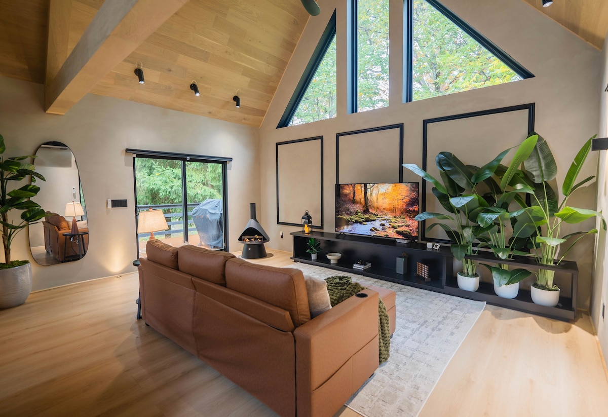 This recently improved riverfront cabin, has a style all its own. Open entertainment space extends on to the 40 ft long deck. The many windows and doors allow nature in, complementing the locally sourced live edge countertops in the kitchen. Beautiful views are seen of the lush landscaping, river and distant mountain, from every room. The kitchen offers all ammenities, such as a dishwasher, large french door style refrigerator, and a ton of storage along with ample countertops.