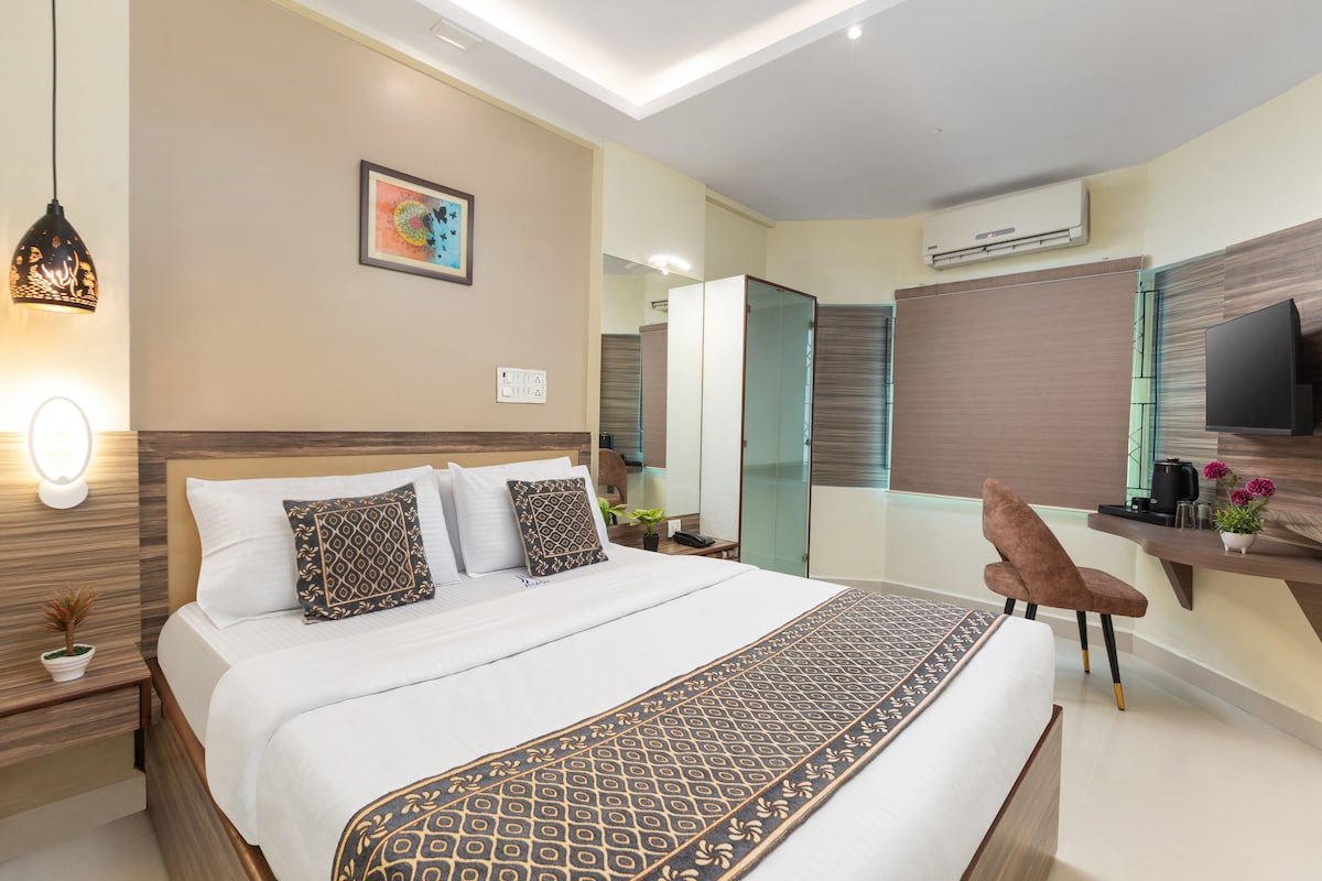 A cozy stay in the heart of Chennai in Nungambakkam. This 200 sq.ft room includes a comfy double bed, private bathroom, work desk, and a compact kitchenette. Located near Apollo Hospital, the American Embassy, Khadar Nawaz Khan Road, and T. Nagar, it's perfect for business travelers, medical visitors, and shoppers alike. Enjoy comfort, convenience, and easy access to Chennai’s key landmarks.