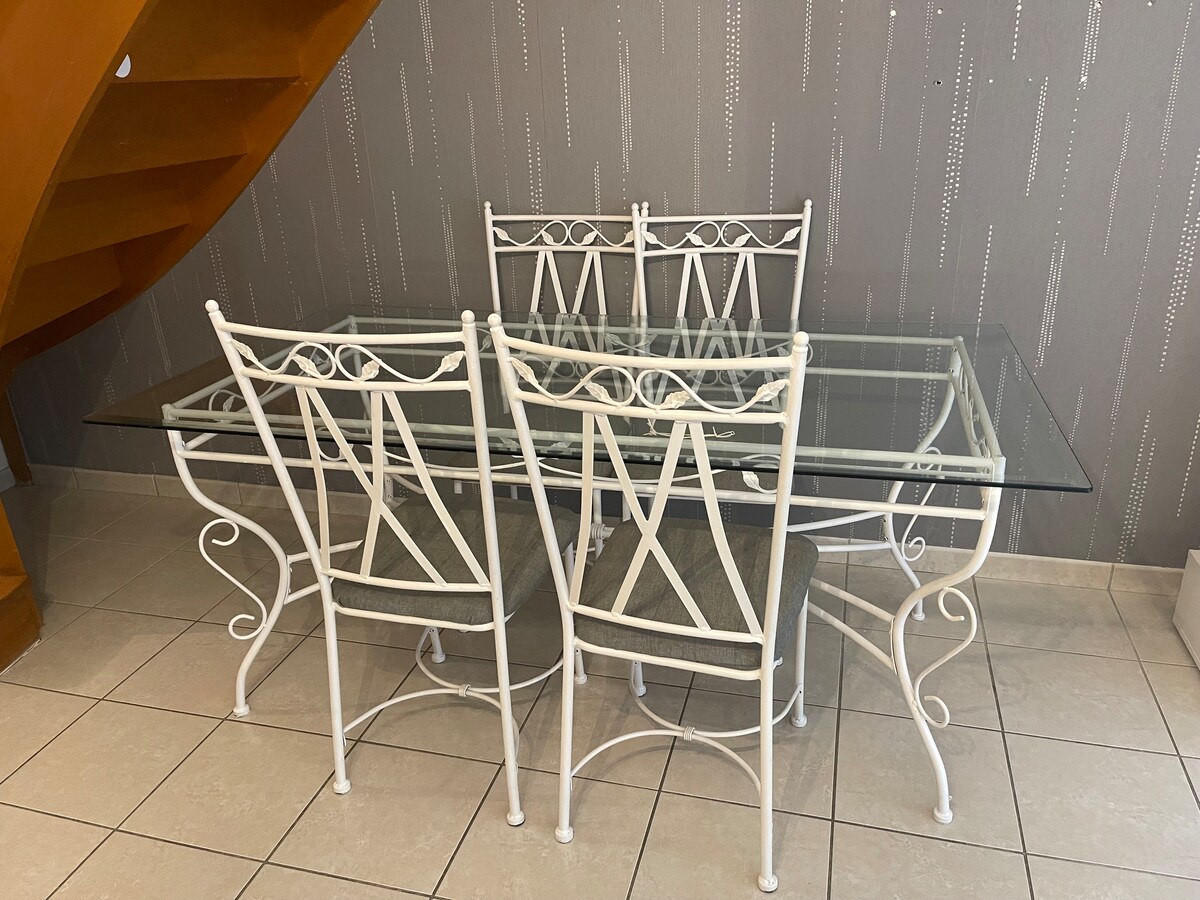 In a private residence, the duplex can accommodate up to 4 guests with a large bedroom upstairs (queen size bed, video projector with Netflix and Disney+) and a spacious bathroom with whirlpool bathtub. You have a sofa bed with mattress for optimal sleeping quality. The terrace with barbecue will allow you to enjoy an outdoor meal in good weather. Close to all amenities (restaurants, bars, supermarkets, tobacco, bakery).