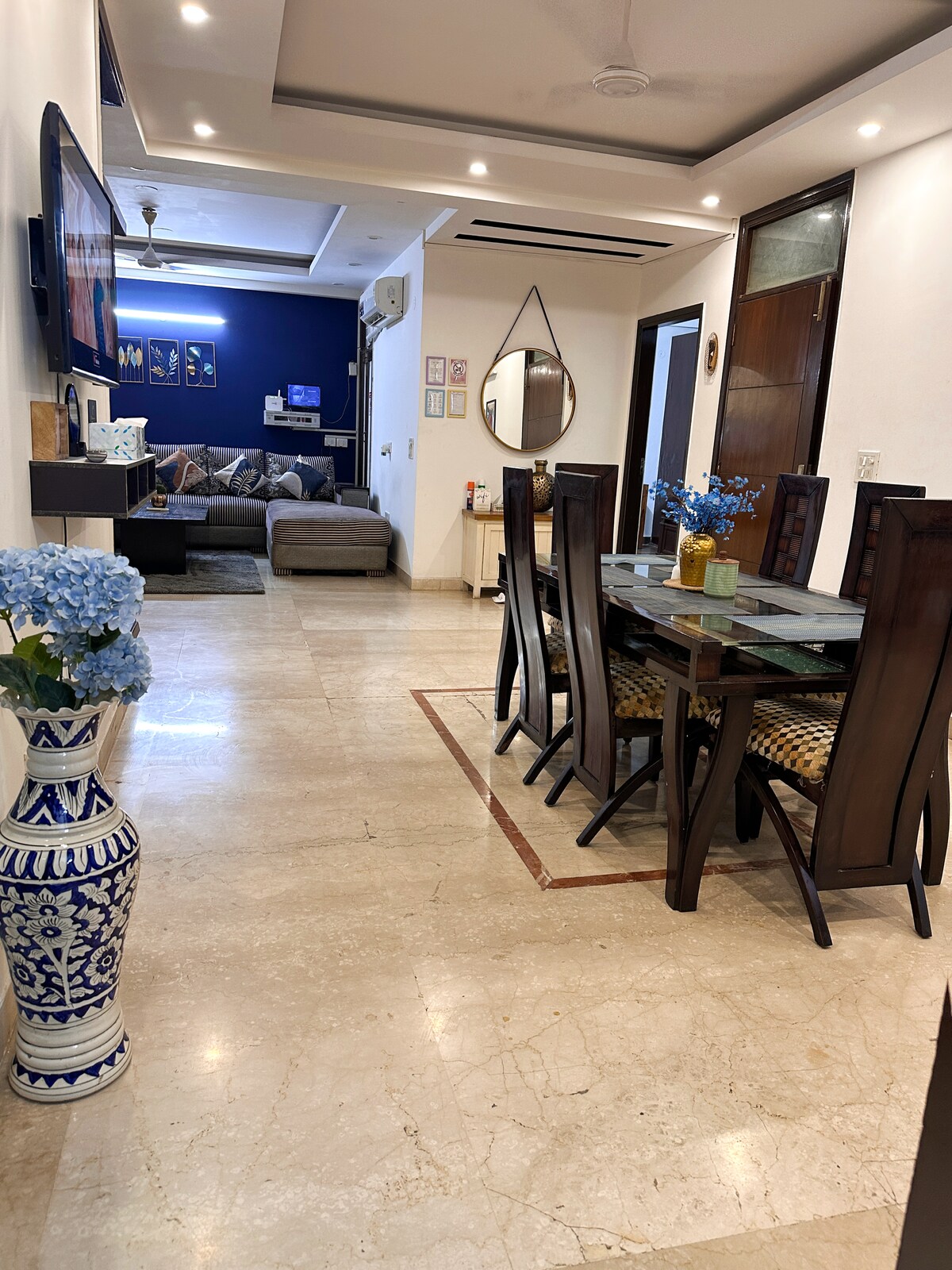 A 3500 sq ft, luxuriously appointed apartment less than one km from Fortis Hospital in Vasant Kunj, 20 minutes from the airport and is located right next to the DDA Sports Complex. It has four bedrooms, all with beautiful views of lush green treetops. Each room has been carefully curated to maximise comfort with large beds and comfortable mattresses. There is ample parking and space for entertainment and parties. Tucked away in a quiet place, there is no sound of traffic & lots of peace.