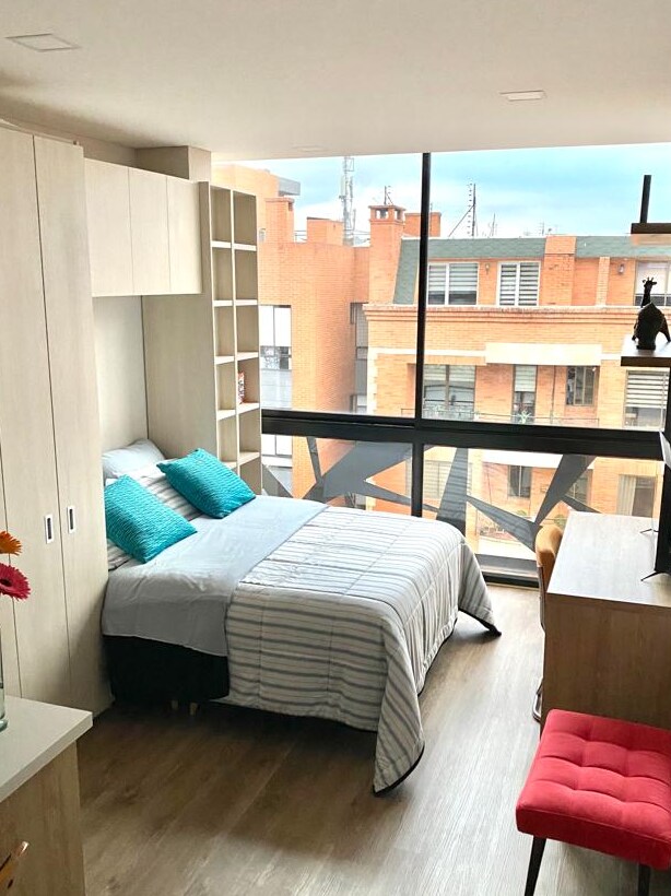 Charming suite in the heart of Bgtá, ideal for couples or travelers. Elegant decor, equipped kitchen and comfortable double bed. Private balcony with stunning views, Social Areas such as Laundry Area, gym, pool table and ping-pong, CoWo, BBQ terrace on the top floor with 360° view and 24-hour security. Close to markets, museums, restaurants in La Macarena, Monserrate, La Candelaria, Mall San Martín and the International Center. Discover the best of Bogotá from this wonderful Suite!
