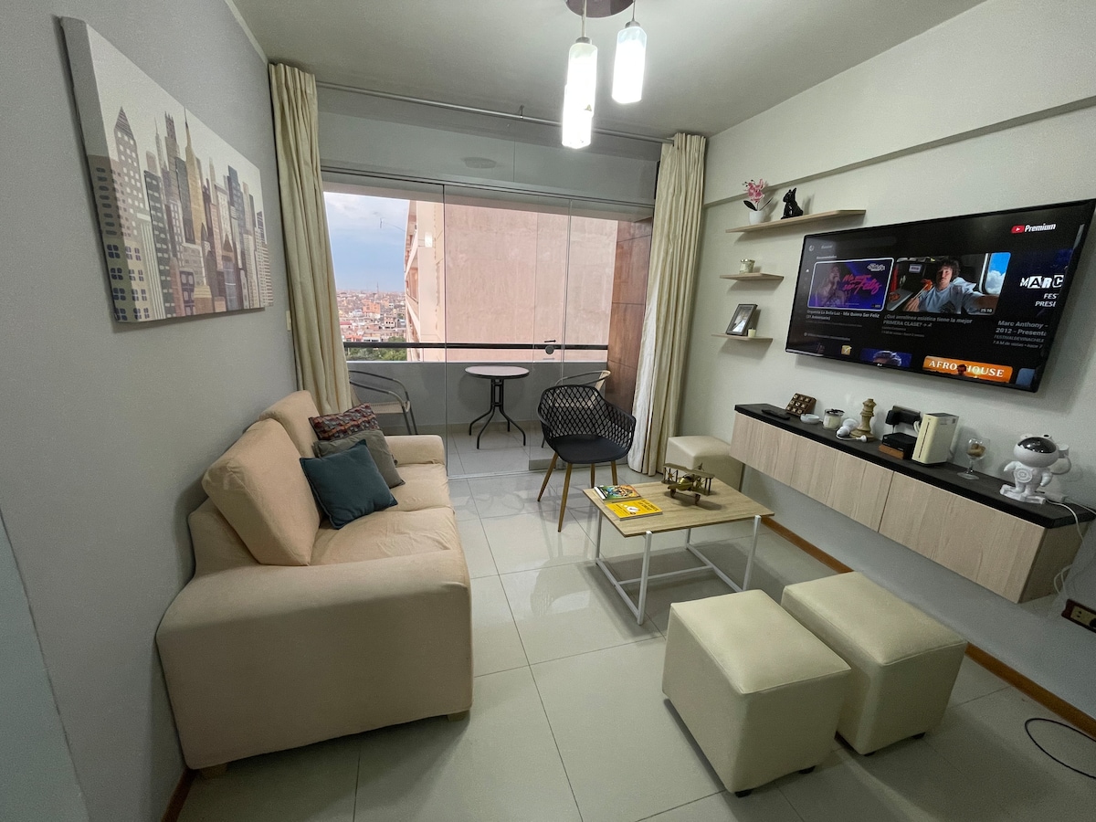 Comfortable apartment in downtown Chiclayo, in the Oasis of the Colibrí Condominium, with common areas (café-studio, gym, cinema, game room), security cameras, elevators. Centrally located and quick to go to places like downtown Chiclayo, Pimentel and Lambayeque.