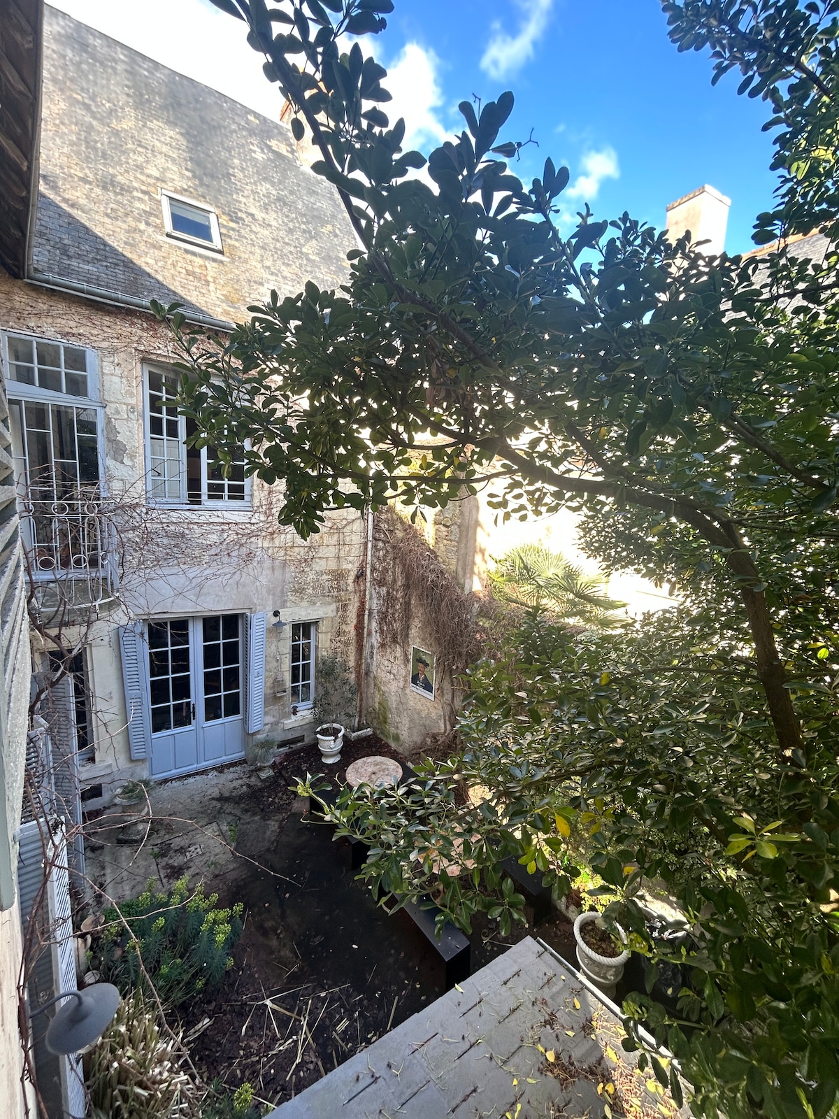 You'll be staying at the foot of the Royal Fortress of Chinon. Located in the heart of Chinon's medieval old town, our studio is a clean, bright, quiet place on the ground floor looking out onto a flowered garden where you can relax during your stay. The studio has a fully equipped kitchen and dining area, bath with a shower, a double bed, a large, comfortable sofa, WIFI, and TV. Just outside the windows is a garden area with both sun and shade and tables available for you to enjoy.