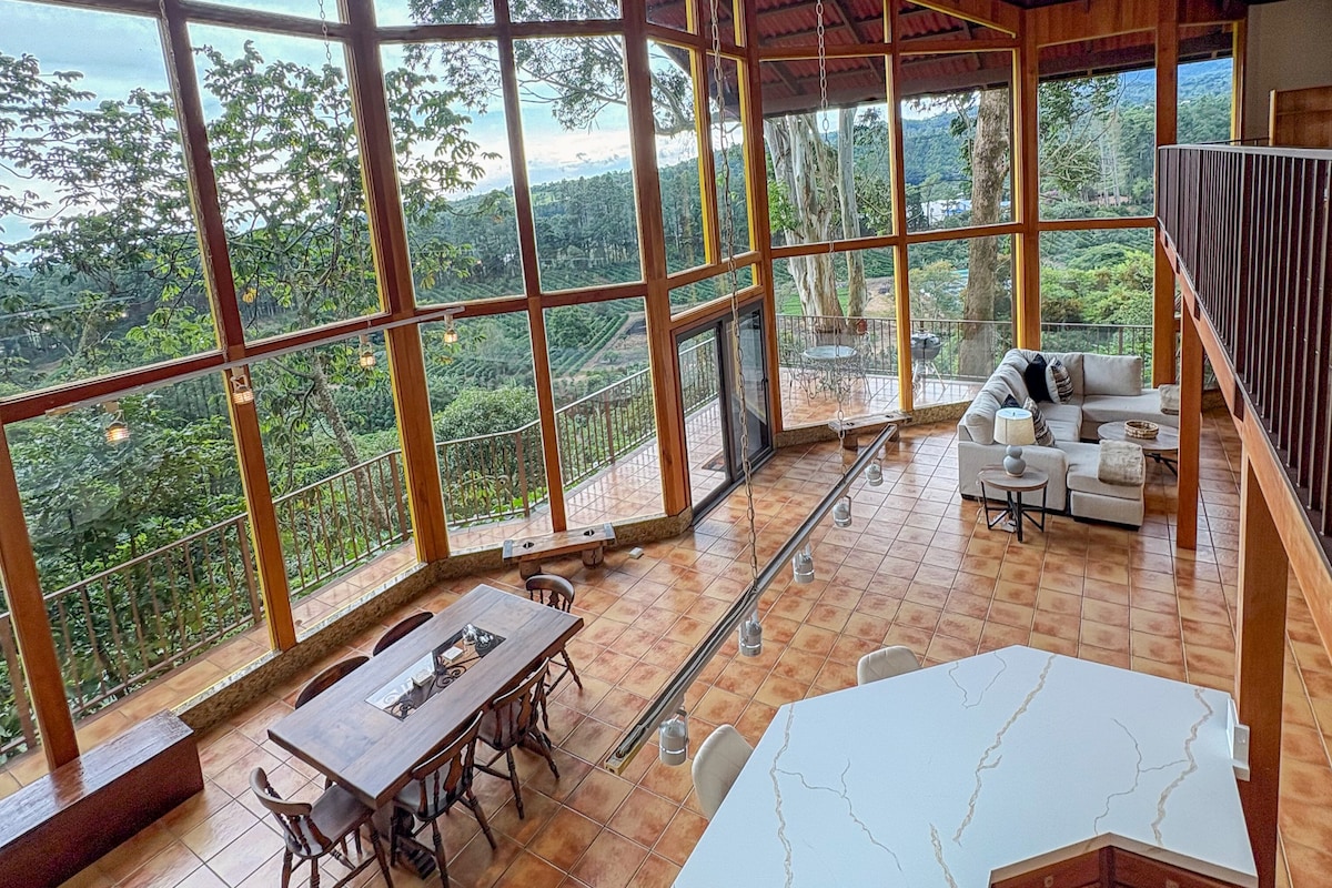 Welcome to the Coffee Cabins. This is one of four stunning A-frame cabins perched on the side of a mountain in the middle of a coffee field. You’re literally surrounded by coffee, both on the trees and in your kitchen with the complimentary coffee grown right here on the farm. Enjoy larger than life views to both the north towards the continental divide and to the west framing Volcan Baru, Panama’s highest peak.