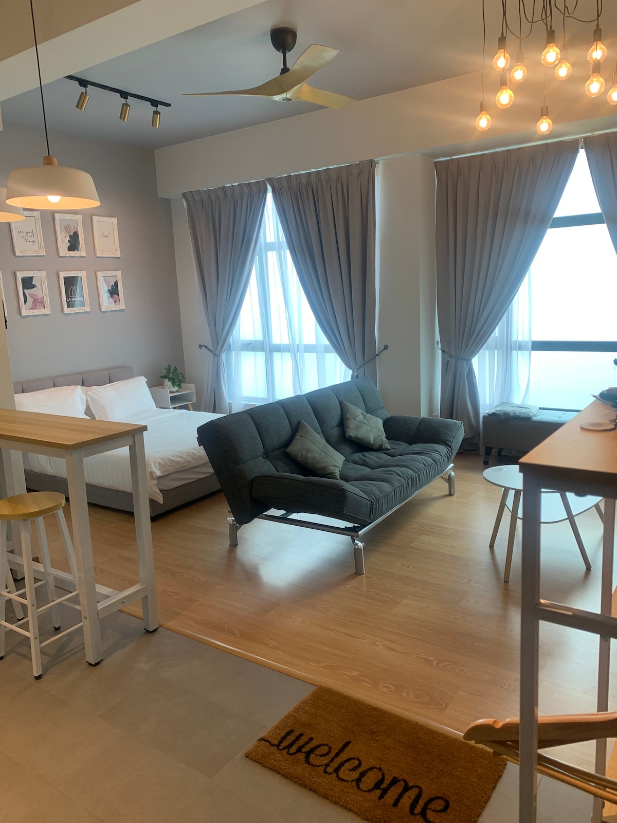 We are Soho type unit with Kitchen/Dinning area, Living room and Bath room . 1 qeen bed in common area , 1 single bed in private room, foldable bed is provided. Our unit is at 11th floor with balcony perfect sea view and pool view can be enjoyed. Beach can be reached just right after the apartment. Facilities provided: Basic cooking equipment (eg microwave, kitchen utensils, and refrigerator) W0ashing machine with dryer Netflix, WiFi , Hair dryer, Iron and iron board