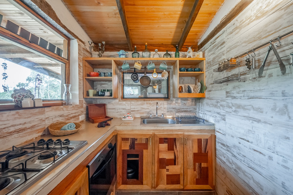Conecta con la naturaleza en esta escapada inolvidable La cabaña esta ubicada en un bosque nativo de robles con acceso a la quebrada, tiene cocina, chimenea, minibar, salon de yoga, incluye desayuno que encuentras en el minibar, deliciosa tortilla española, granola y siempre tendrás cafe y te para preparar Estamos a 20 minutos de la estación de bomberos de Villa de Leyva en carro Vivimos en la misma finca a 60 mts tendrás privacidad total Del minibar puedes comprar snacks