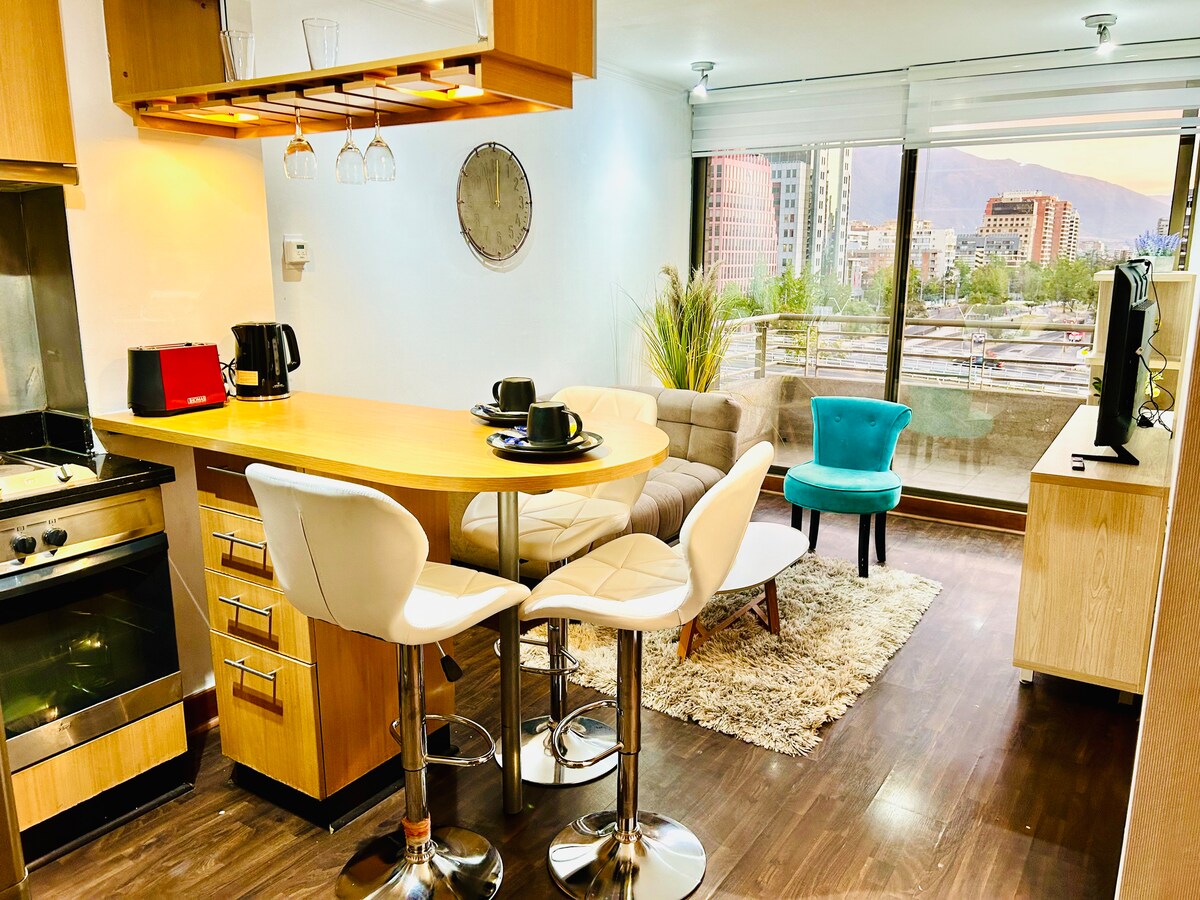 Enjoy a great experience in this save location in Barrio El Golf. Modern and cozy apartment with a privileged location, in the heart of gourmet cuisine and luxury shops of Santiago de Chile "Barrio El Golf". The neighborhood is characterized by its great architectural value and its attractive and varied cultural, gastronomic, and recreational offer. (restaurants, cafes, bars, theaters, museums, design galleries, etc). A few meters away is the metro station ¨Escuela Militar¨ and Plaza Peru.