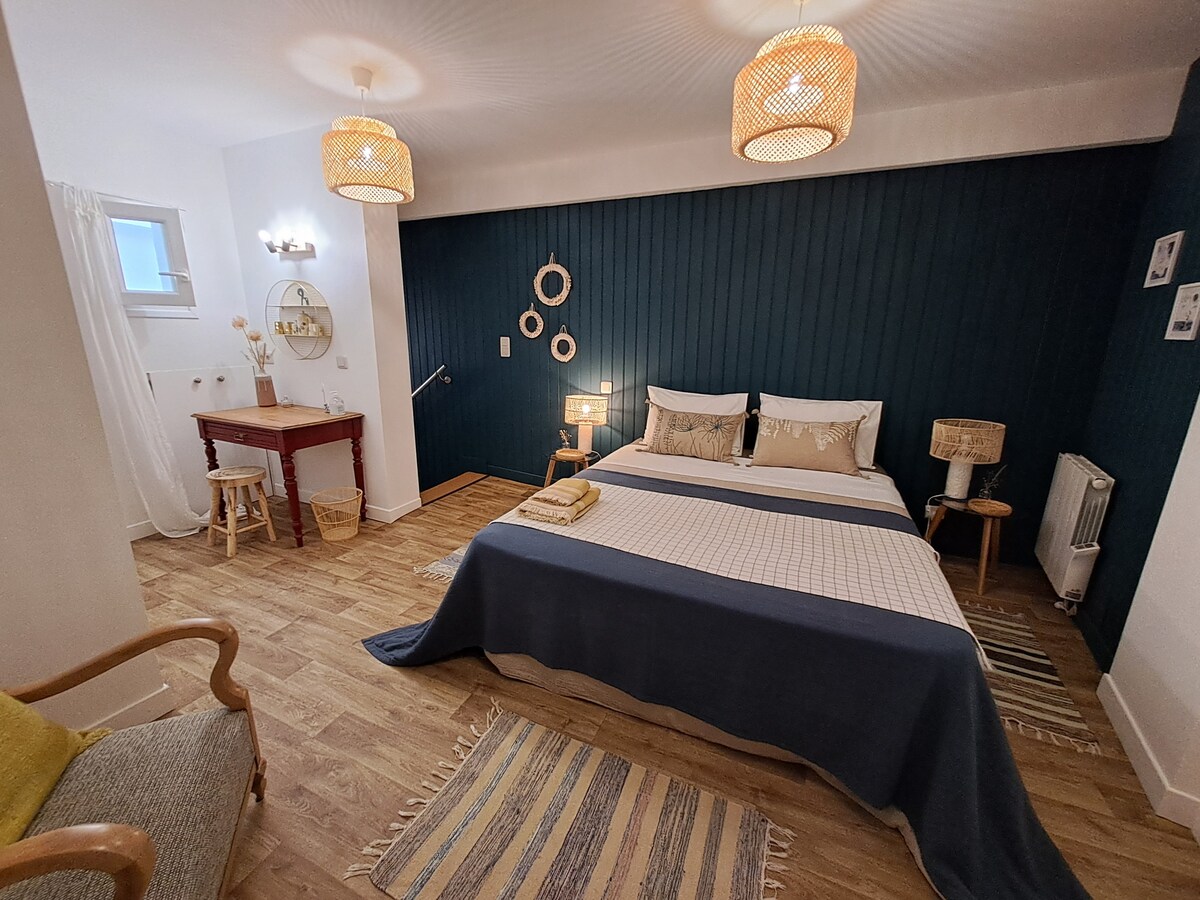 "Carefully decorated, this room offers all the comforts you need for a pleasant stay. You will find a cozy 140 x 190 bed, a coffee corner for your moments of relaxation, and a private bathroom, perfect for more privacy. We are in the heart of Saint-Savinien, which allows you to enjoy the calm and authentic atmosphere of the village, close to shops and the Charente river. It is a perfect place to relax while being in the center of local life.