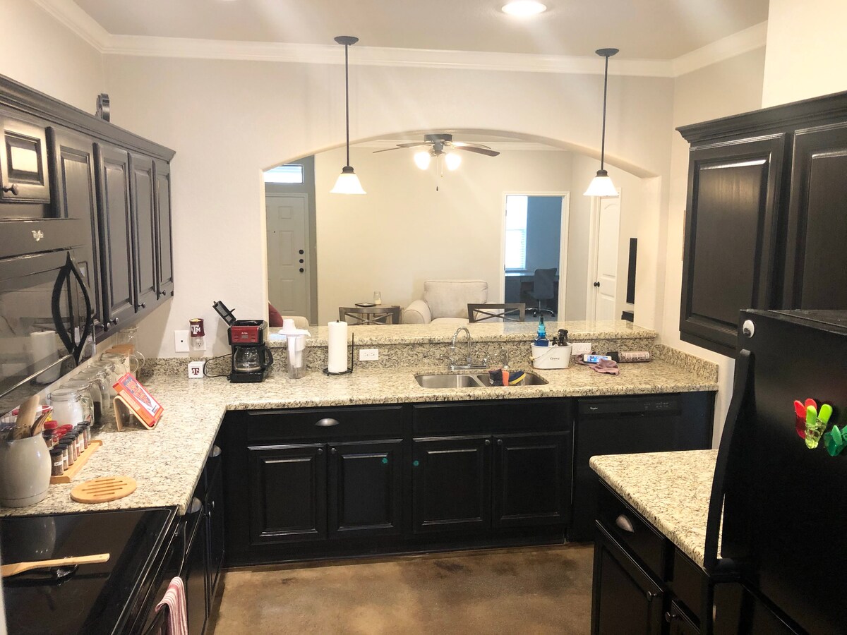 Central location right off Hwy 6, 11 minutes to A&M campus, 6 minutes to Blinn. Walk to Starbucks, Cracker Barrel Restaurant, TruFit Gym, Shopping and more! An extremely comfy king bed in each of the two bedrooms, a private fenced backyard, blazing fast wifi and everything you need for a long term stay (or a quick one). You'll have: ✔ BBQ ✔Outdoor dining ✔coffee ✔Tea ✔65" TV (amazon prime movies, Roku, Fire & Local OTA Live TV) ✔Wifi ✔ Parking ✔COMFY King Beds