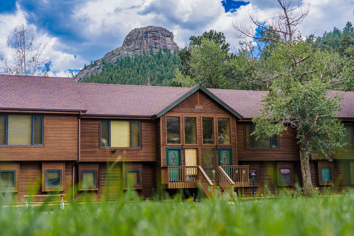 Completely Remodeled! Cozy mountain 2 BR 2 bath condo nestled right into Roosevelt National Forest and just steps from roaring Fall River. The private deck makes for the most amazing view overlooking it all. Enjoy your morning coffee there watching the wildlife, or evening wine soaking in the hot tub. It's all sure to sooth the soul! The interior has a sweet modern/vintage vibe including some fun eclectic custom murals. Best of all it's only minutes from RMNP entrance & Downtown Estes. Wi-Fi