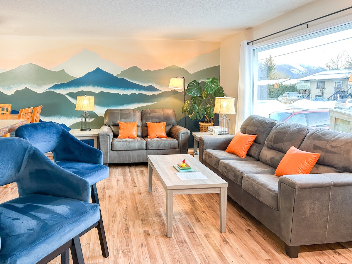 Discover the convenience and serenity in a newly built modern 3-bdrm haven, just a 5-min drive from downtown Golden. Within walking distance of the Golden Skybridge, this home offers a breathtaking mountain vista with a fully equipped kitchen to savor the joy of cooking. Embrace relaxation by the fireplace, where a spacious couch transforms into a plush bed. Pamper yourself in the private hot tub with spectacular views, experience restful nights in our luxurious beds. The getaway awaits!