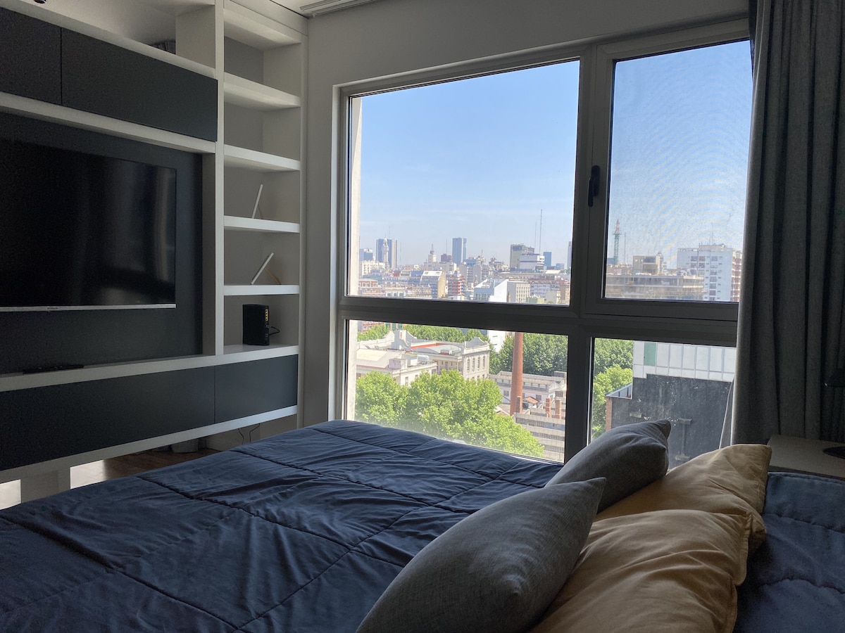 Accommodation for adults or children over 12 years old only Studio apartment in the Quartier Madero Urbano building in a privileged area of Buenos Aires, between San Telmo and Puerto Madero. Enjoy panoramic views from our 9th floor. 24/7 security and a wide range of amenities: gym, spa with jacuzzi, dry and wet sauna, and outdoor pool. Equipped with a large refrigerator with freezer, electric oven, dressing room, desk and Smart TV with cable. Close to everything. Ideal for a comfortable and safe stay.