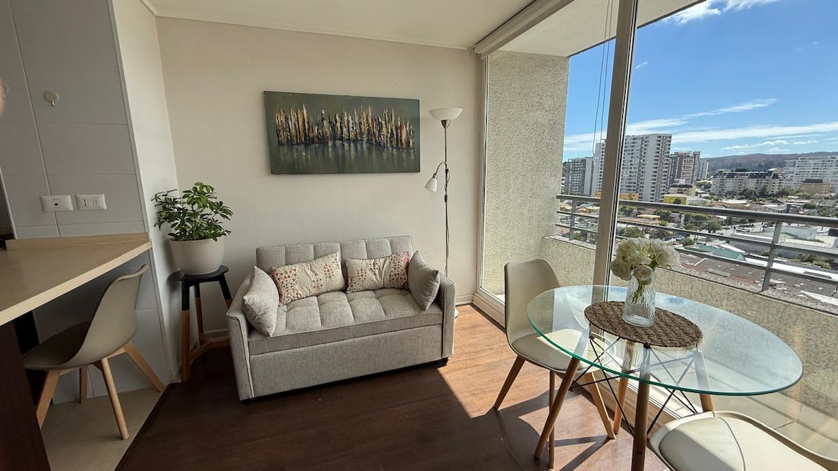 Your perfect stay in Concepción! Modern 1-bedroom apartment, ideal for travel, work, or a quick stopover. Just 5 min from the airport and 3 min from the mall. Safe and quiet residential area. Enjoy comfort, style, and everything you need for a great stay. 🛏️ Double bed + single sofa bed 🌇 Private terrace 🏋️ Gym + laundry access 🚗 Free parking 📡 Fast WiFi + TV 🍳 Fully equipped kitchen Book now and feel like home!