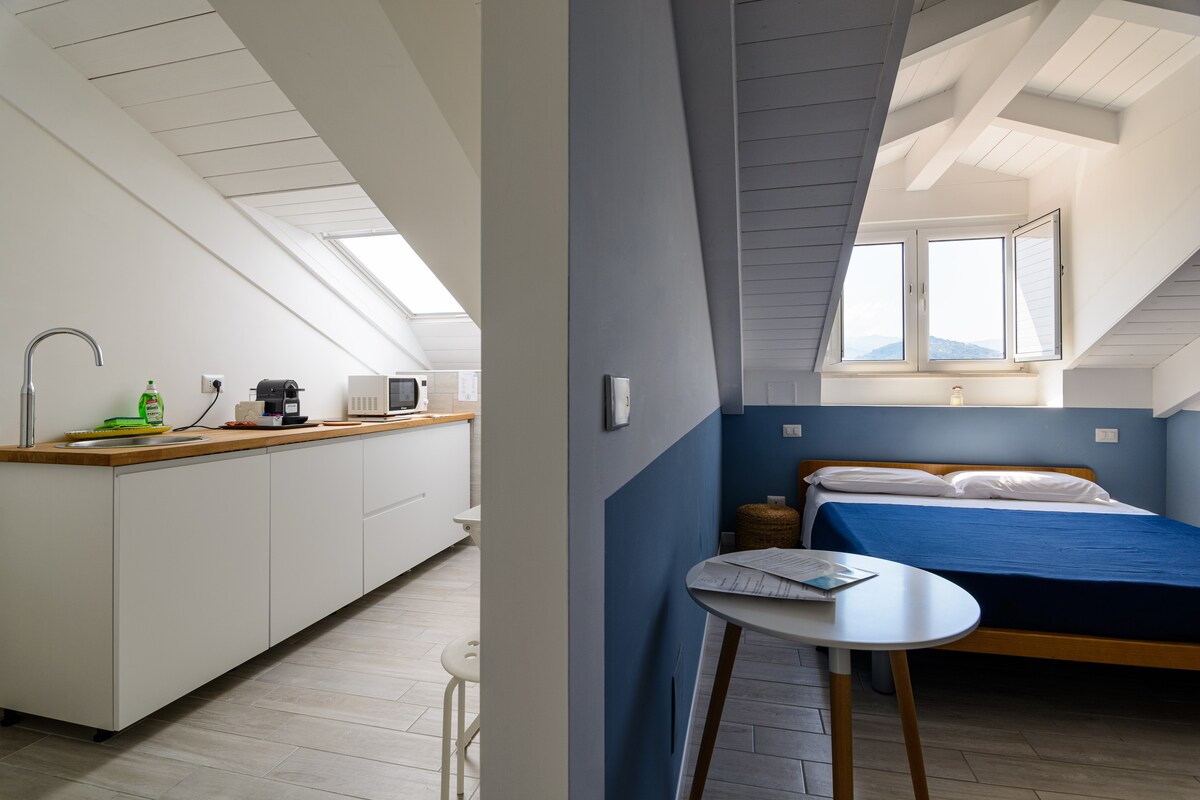 Seafront penthouse with all comforts and a terrace where you can spend pleasant moments or sunbathe without having to walk down to the beach. Located on the sixth floor, without a elevator, it is just a few meters from the public beach and lidos. It is located in a central area equipped with supermarkets, bars and shops. Between the historic center and the San Marco promenade, easily reachable on foot and about 800 meters/ half mile from the Agropoli-Castellabate train station.
