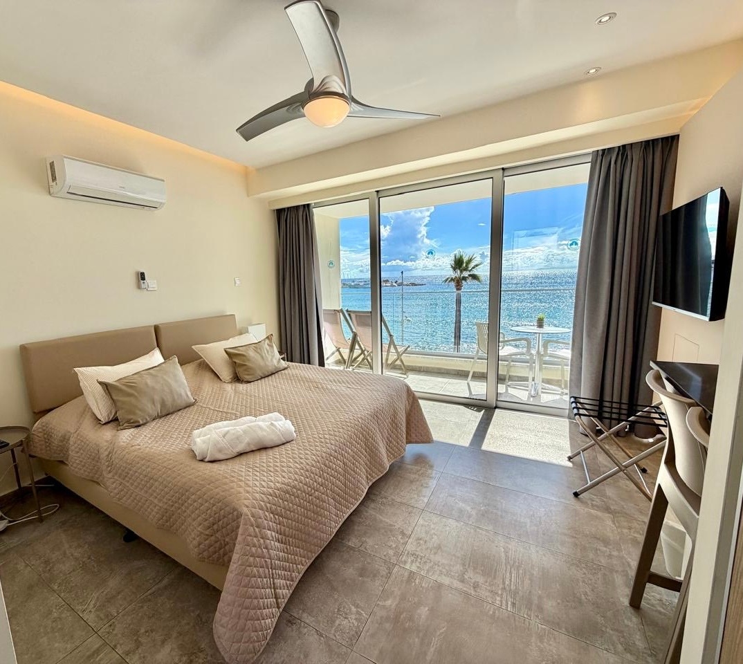 Reg. Number: AEMAK-PAF 0002076 Smart TV. !The construction of the seafront pedestrian way is done . Modern renovated 1 bedroom apart ( 47m2 ) with a living room + large uncovered terrace (14 m2)with panoramic sea view , 50 m from the sea. Apartment is well equipped with appliances . Located 1 minute walk from the small beach before the complex and 8 min walk from the spacious sandy Coral Bay beach with all facilities . WiFi and Netflix are available. Electricity is extra charge by meter.