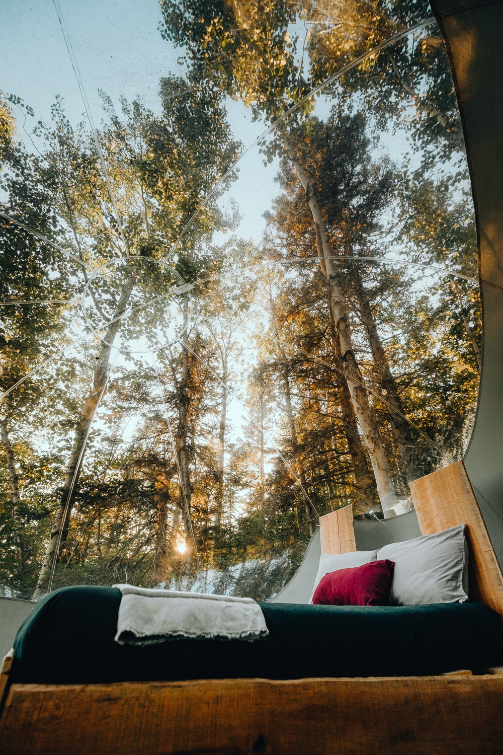 Enjoy a unique experience under the stars, in the middle of the Gaspé forest. Enjoy stunning views of the surrounding nature, comfortably tucked under the duvet. This immersive experience offers you a perfect balance between comfort and connection to nature. The transparent part of the bubble allows you to admire the forest and the Milky Way, while the front part, made of opaque fabric, preserves your privacy. The bubbles are located at Folies Boréales.