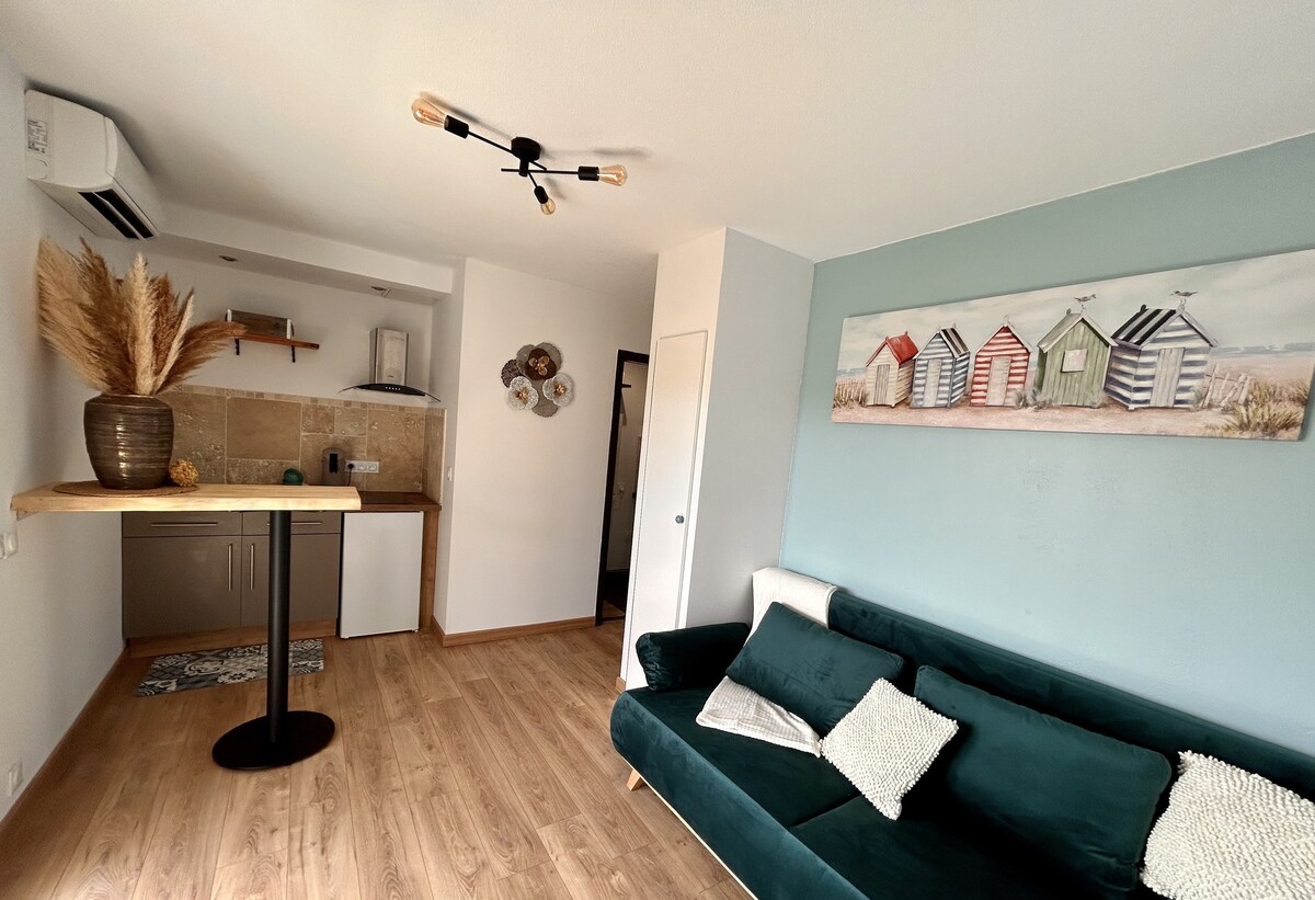 Charming T2 tastefully renovated and fully equipped with unobstructed views of the marine lake. The accommodation has a cozy bedroom with double bed and plenty of storage, a living area with a 2-seater sofa bed, a fully equipped kitchen area overlooking the loggia. Located in a quiet residence, this beautiful bright apartment has a dedicated parking space. Located close to all shops, 5 minutes by car from the beach and 35 km from Spain.
