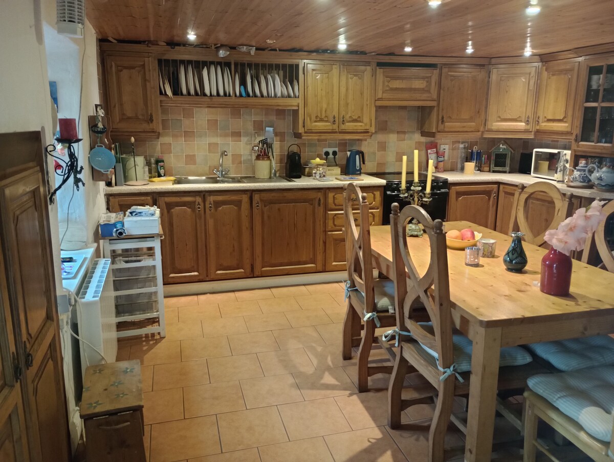 This wonderful, recently modernised farmhouse is a STEAL! Enjoy a hot tub, king bed, full kitchen, fast WiFi, 45” TV & projector with family-friendly apps. Only 7 mins to Blackwater Golf Course & beach! • Main heating is via the fires. • Pets welcome (€50 fee per pet). Note: This is a rural property in the countryside—occasional wildlife or insects may be present despite regular upkeep.