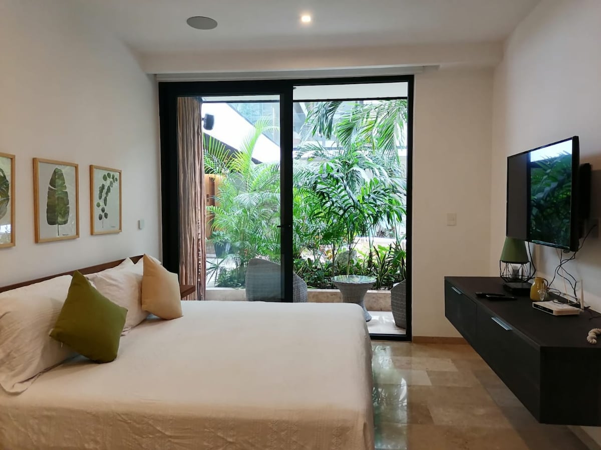 Experience comfort and tranquility in our spacious and cozy ALUNA SUITE. Enjoy a fully equipped kitchen, king-size bed, smart TV, 500 Mbps WiFi, and a terrace with a private Jacuzzi overlooking nature. Relax in this serene environment, inside the CASA JUNGLA complex, located in a private subdivision on Calle 38, just 2 blocks from 5th Avenue, the beach, restaurants and supermarkets.