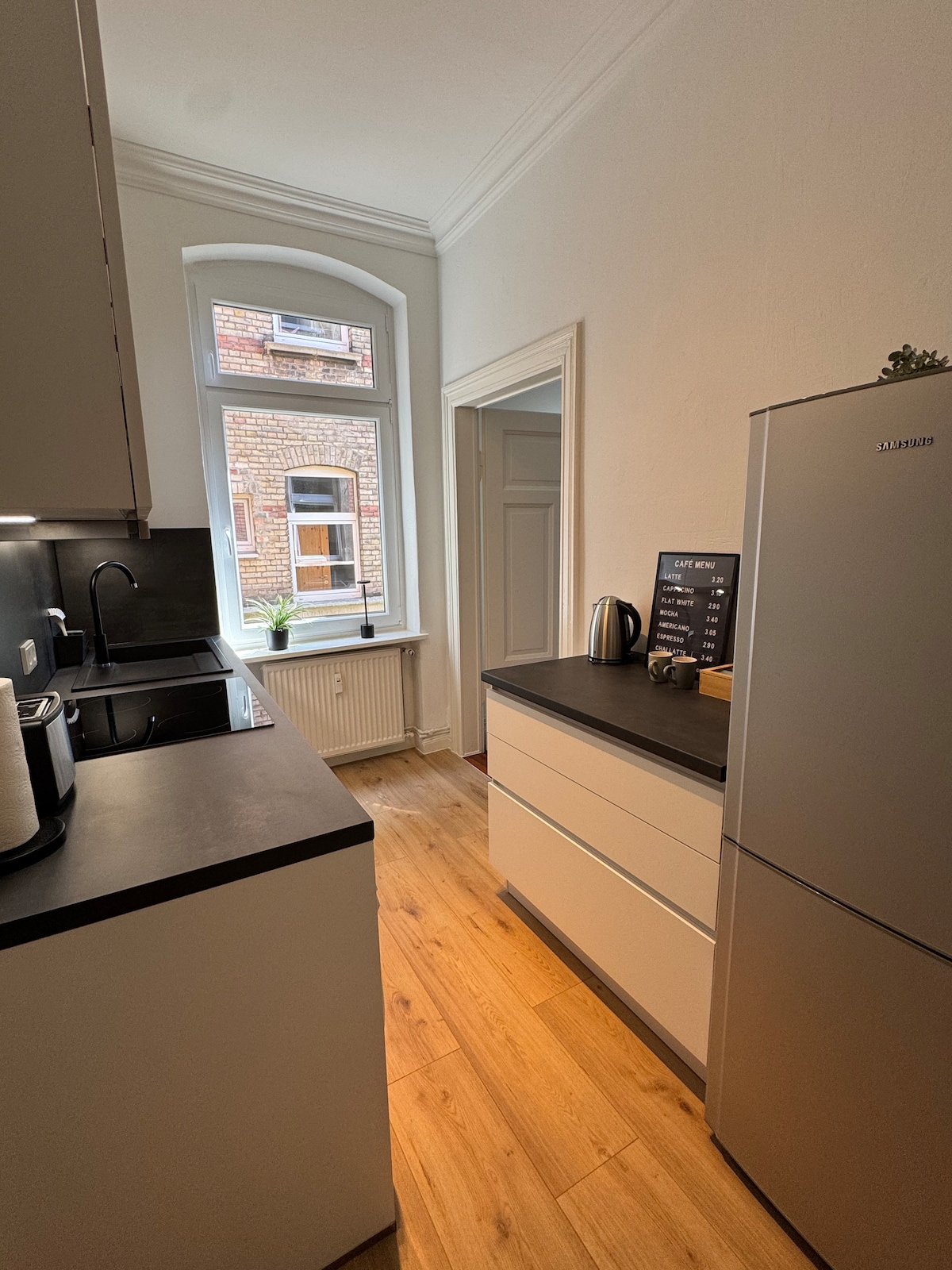 This modern designed apartment is located in the historic house of the dance master, right on the Schlossplatz, in the middle of Wolfenbüttel. Despite the central location, you will stay here quietly and surrounded by greenery. The balcony is suitable for both breakfast and a glass of wine in the evening, or simply to relax with bird chirping. The extra-wide window seats invite you to enjoy your morning coffee/tea overlooking the Schlossplatz, or directly at the castle. The apartment is 80 m².