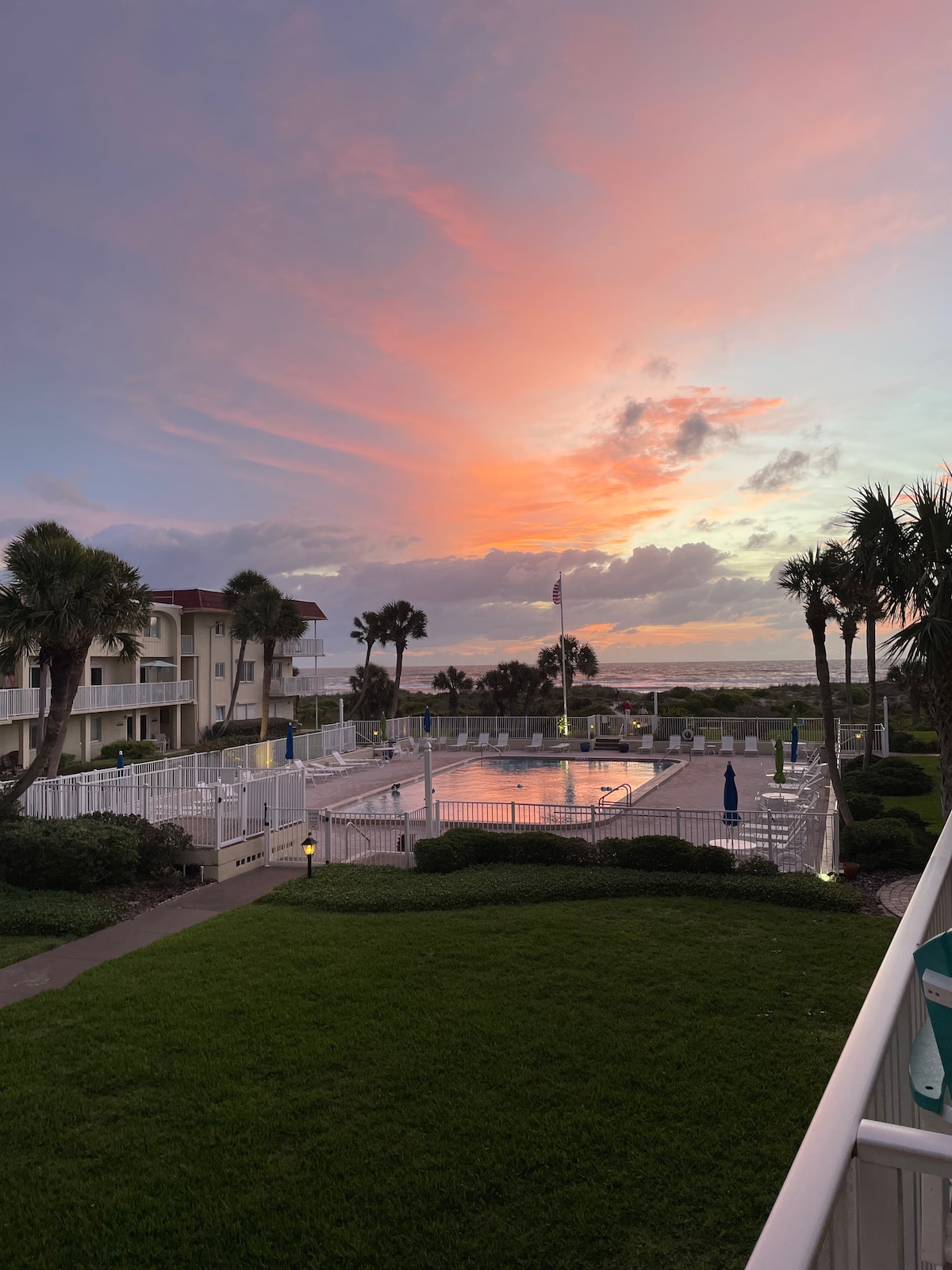 Beautiful St. Augustine Beach ocean and pool views from this 2/2.5 townhouse style condo, just steps to the beach. Come enjoy everything this vibrant city has to offer. 2 quiet bedrooms and bathrooms upstairs. 2 private balconies. Downstairs is a full kitchen, dining area for 6 (or well lit workspace), half bathroom, living area w/ new 65" TV, 10 minutes from historic downtown. Family friendly resort community w/ pools, tennis, pickleball and bocce’ ball courts. Beach chairs & towels provided.
