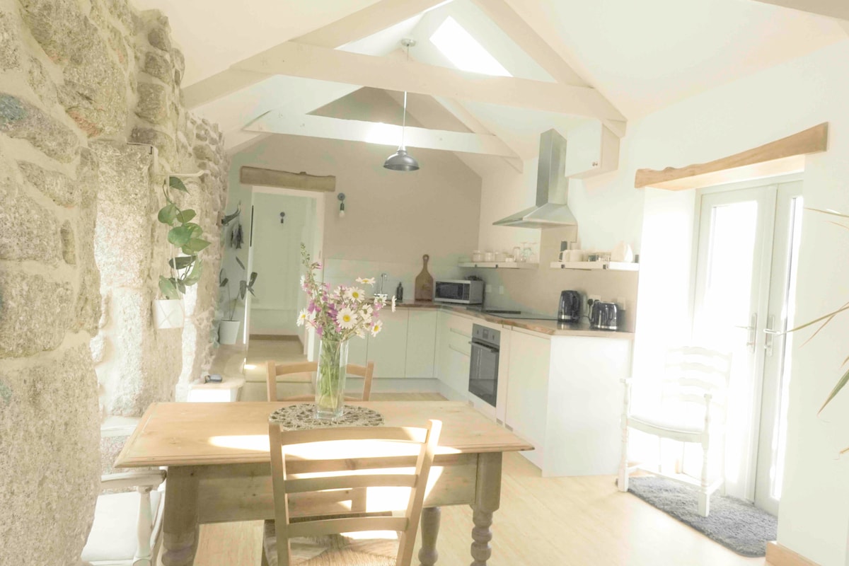 Bolitho Barton is a historic farmstead in the wild centre of the peninsula, yet within easy reach of both the north and south coastlines. The Annexe is a cosy modern space adjoined to the old farmhouse, with its own conservatory and garden. There is an open-plan kitchen/dining/sitting room and an additional spacious conservatory which can be used for dining or just as another sitting area. The two bedrooms can be arranged as a twin room and a king-size double, or as two king-size doubles.