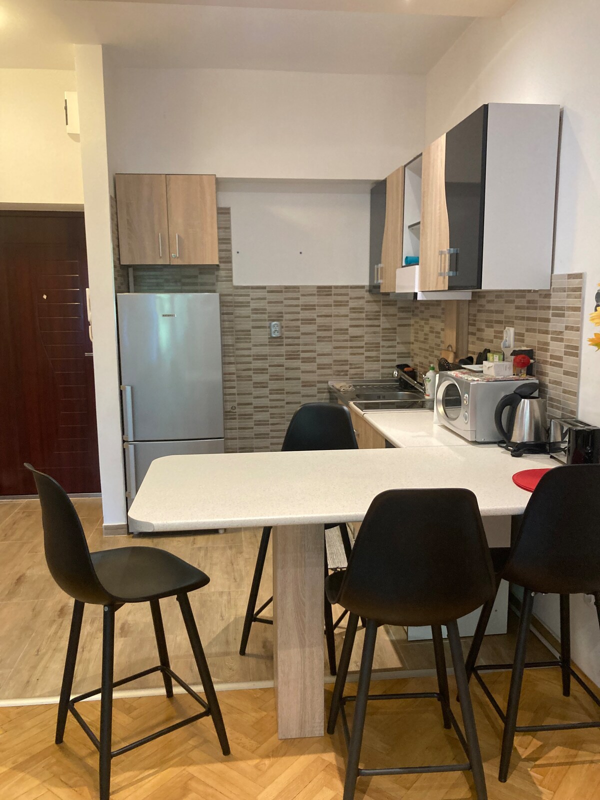 Apartment in a quiet neighborhood. The apartment is disinfected with a germicidal lamp after each guest!). Freshly renovated, modern furniture! The city center is a few minutes by car and 10 minutes by public transport. An enclosed, covered space is provided for the car, which is located a few meters in front of the apartment door, so you don’t have to bother with luggage on the stairs.
