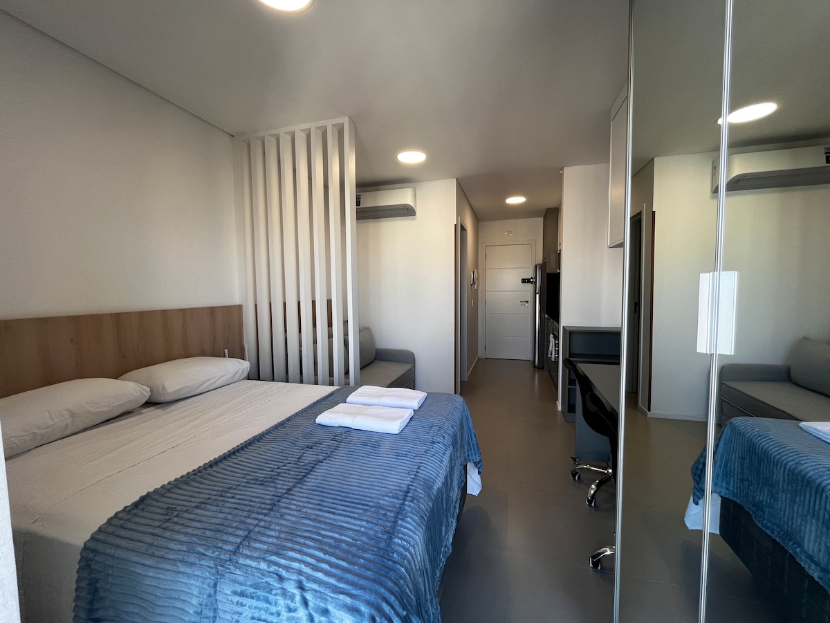 Recently renovated and decorated studio at the Civic Center with: air conditioning in all the environment, full kitchen, smart TV and private Barbe The building offers a heated pool, gym, panoramic terrace, sauna, playroom, jacuzzi and laundry (paid) Ideal for up to 2 people, we provide first-line towel bedding Excellent location, close to shopping malls, markets, restaurants and bakeries with easy access to explore the city Paid parking available on site