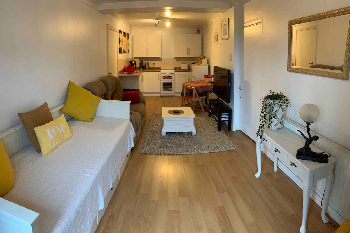 Sleeps 4, Twin Single Beds in bedroom plus two more in Pull-out Double bed in the lounge-cum-kitchnette area, Electric Shower & Toilet, Wardrobe + storage; Kitchenette with Electric Kettle, Toaster, Air-Fryer, Fridge-Freezer, Microwave, Electric Ceramic Cooker with Oven/Grill, Pans, Crockery & Cutlery, Fold-out Dining Table for 4; Living area with a Sofa for two, Settee-pull-out double bed, Freeview TV, Parking; Centrally heated + heaters.