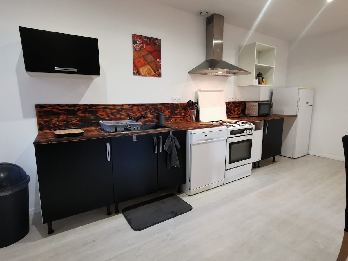 Maison individuelle de 80m² sur 2 niveaux, proche de tous commerces, restaurants, centre ville et grandes surfaces. Parking gratuit sur place et à proximité. Cuisine entièrement équipée (four, micro-onde, lave-vaisselle, frigo...) donnant sur la salle à manger et son salon équipé d'un canapé convertible. A l'étage, deux chambre avec un lit en 140 dont une avec un bureau et l'autre avec un lit bébé à barreaux Attention linge de lit non fourni. Une salle de bain avec douche et double vasque.