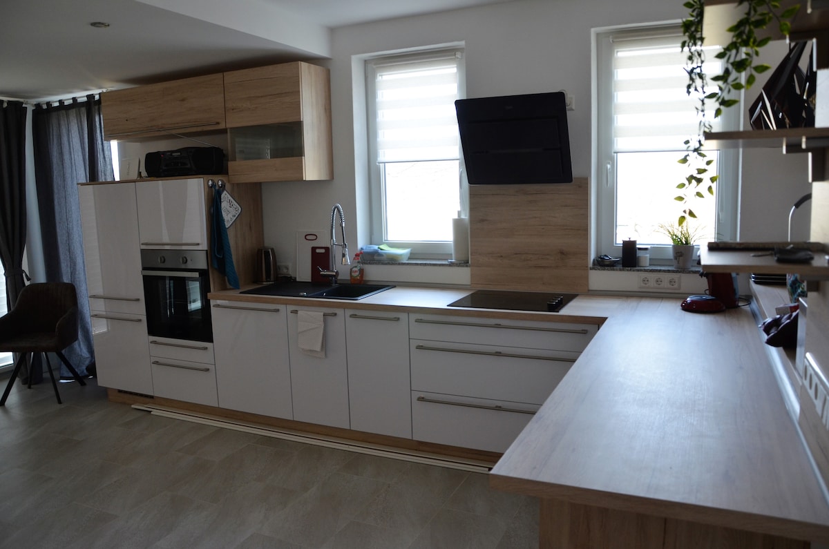 Homemade Apartment is far away from noisy cities. No matter if you are travelling for business or simply taking few days off with your family - you will find here peace, tranquillity and possibly to get really close to the nature, . Build in 2022 holiday apartment, has fully equipped kitchen, beautifully designed living room, en-suite bedroom and a gallery (max. gallery hight 1.7m). Our garden is still under construction but there is a direct access to fields and forests.