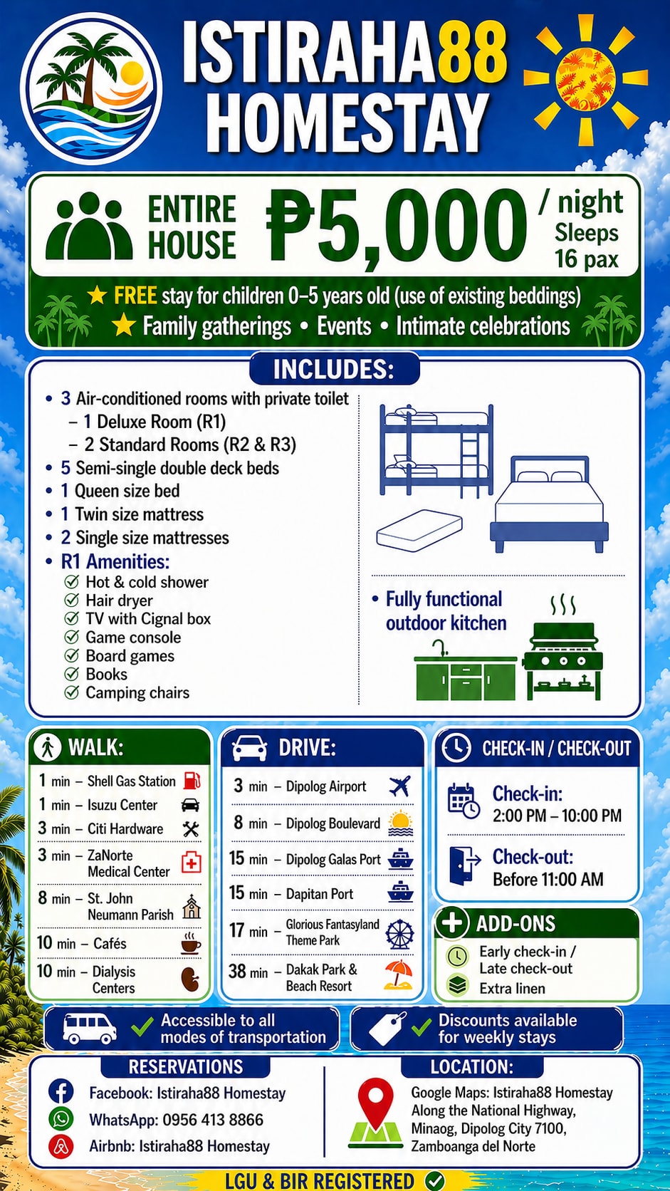 🌴 Cozy & Convenient Stay in Dipolog 🌴 Relax at Istiraha88 Homestay, your comfortable home along the National Highway in Minaog, Dipolog City. Enjoy air-conditioned rooms, fast WiFi, a fully equipped kitchen, and a peaceful atmosphere perfect for families or groups. With easy access to nearby attractions and essentials, it’s the ideal place for both short and long stays.
