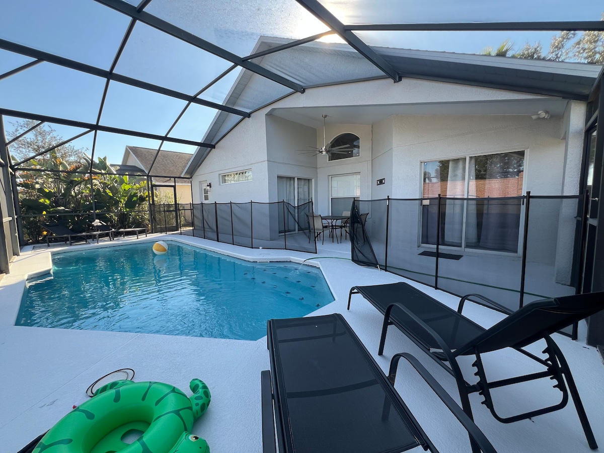 Sit back and relax in this stylish home with all the amenities you need for a fun family getaway. This home has a spacious layout with 3 bedrooms and 2 baths. We have thought of everything so you don't have to-toiletries,washer/dryer, and wifi. Enjoy your morning coffee in the screened in pool area with a beautiful sunrise and lake view or sip a glass of wine while floating in the pool. Just minutes to Theme Parks and major highways, this is the dream home you have been waiting for!
