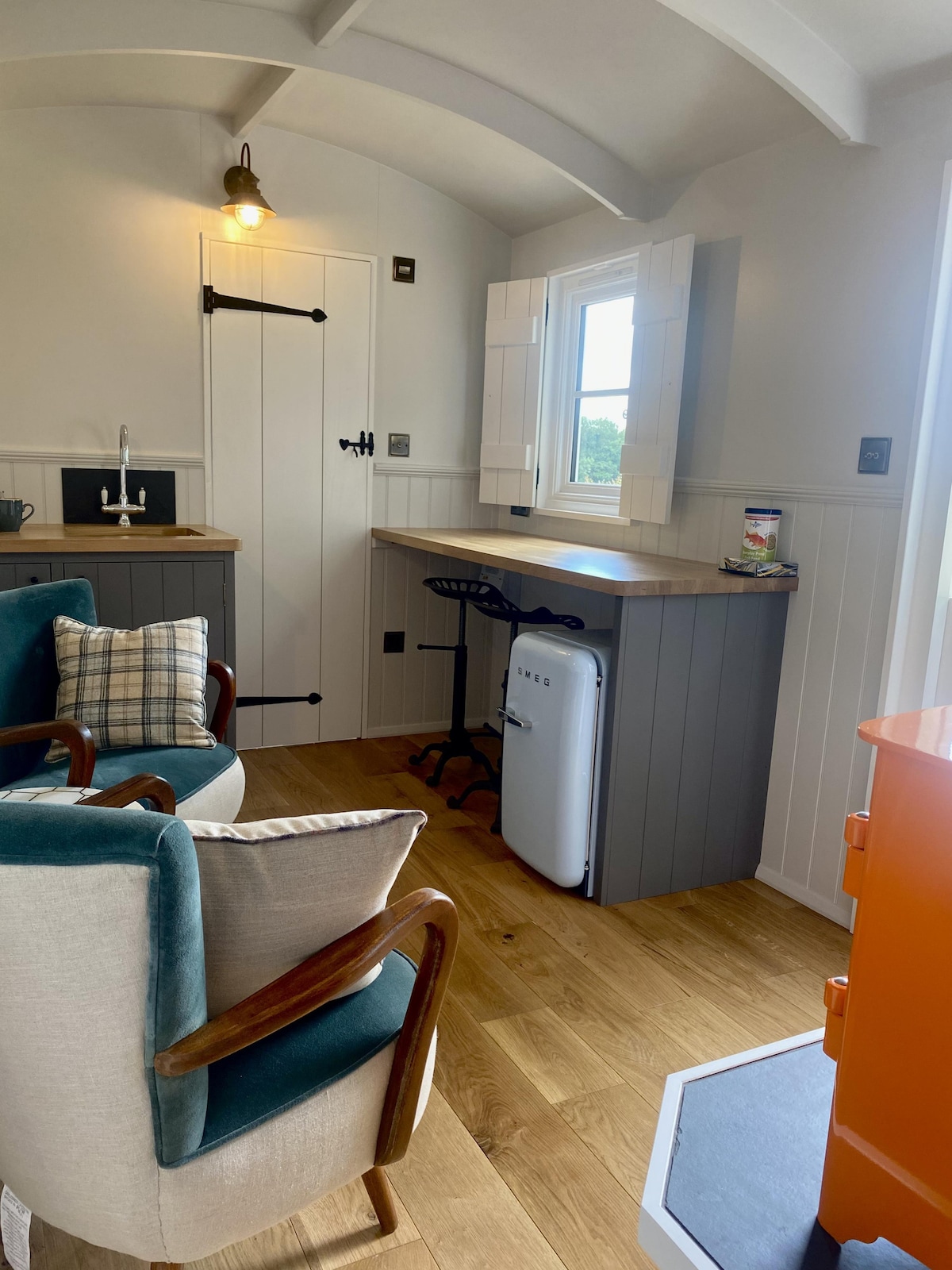 Our shepherd’s hut is situated in a private part of our garden on the banks of the River Brett in the historic village of Lavenham, a two-minute walk from the Market Place with its Medieval Guildhall and Little Hall, a 14th century hall house. Lavenham has much to offer with its listed buildings, independent shops, restaurants, pubs and two small but well-stocked supermarkets. Footpaths make it easy to access the surrounding countryside and enjoy views of the village and its magnificent church.