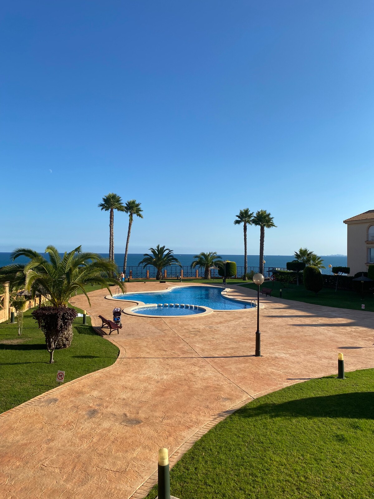 Super cozy studio apartment in authentic Spanish environment 200 meters from the beach. Local church, ice cream shop, supermarket, restaurants, bakery, butcher, bars and disco. Just opposite the apartment, there is a nice sports facility with fitness, cross fit, paddle, pool, teaching of various sports and cafeteria. Access is purchased on a daily, weekly or monthly basis. The apartment's window section can be opened completely, from which there is a view of the park and sports field and a view of the sea. Clothesline, sunbathing area and lookout post from the roof terrace.