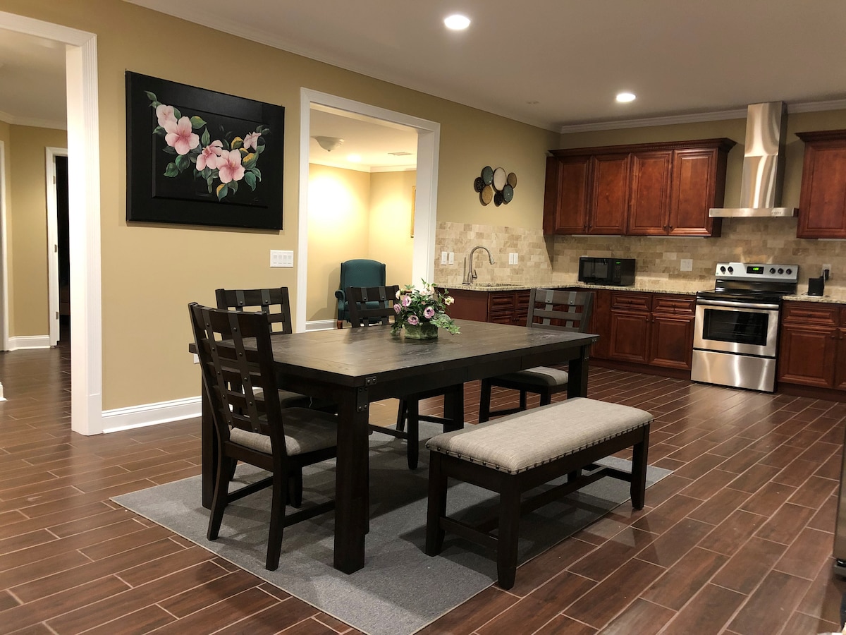 This wonderful cozy studio is super private, with its own entrance right on the side of the house. Plus, it comes with a full kitchen and bathroom. It’s a peaceful, private space with a well-equipped kitchen featuring a big refrigerator, a queen-size bed, a 45” smart TV, a private entrance, an outdoor deck that leads to the backyard, and parking right next to the unit. We’re just a 30-minute drive to downtown Atlanta, Mercedes-Benz Stadium, the GA Aquarium, and 15 minutes to Gas South Arena.
