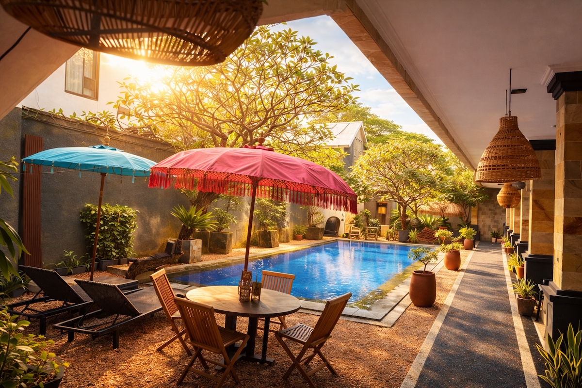 Beautiful atmosphere in the middle of heart of Sanur, located near the famous Sanur beach just 5 minutes from our property and close to the shopping centre, restaurant and the city of Denpasar. Feel the relaxing sensation by staying with us in our spacious room and pool view in our balcony terrace with helpful staff 24 hours and free wifi in our property.